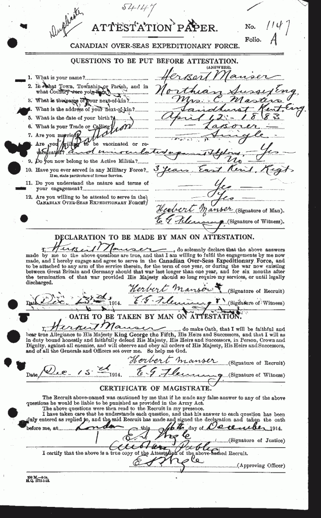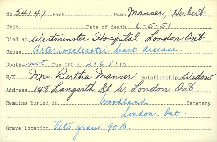 Manser, Herbert: Service no. 54147 Digitized Service Record Source: 18th Battalion Nominal Roll, April 1915. Find-A-Grave Source: Operation Picture Me via The 18th Battalion Facebook Group. London Free Press Circa 1917. Share this: Click to email a link to a friend (Opens in new window) Email Click to share on Facebook (Opens in new window) Facebook Click to share on X (Opens in new window) X Click to share on Reddit (Opens in new window) Reddit Click to share on LinkedIn (Opens in new window) LinkedIn Click to print (Opens in new window) Print Click to share on Tumblr (Opens in new window) Tumblr Click to share on Pocket (Opens in new window) Pocket Click to share on Pinterest (Opens in new window) Pinterest Click to share on Telegram (Opens in new window) Telegram Click to share on WhatsApp (Opens in new window) WhatsApp Like Loading...