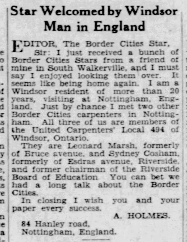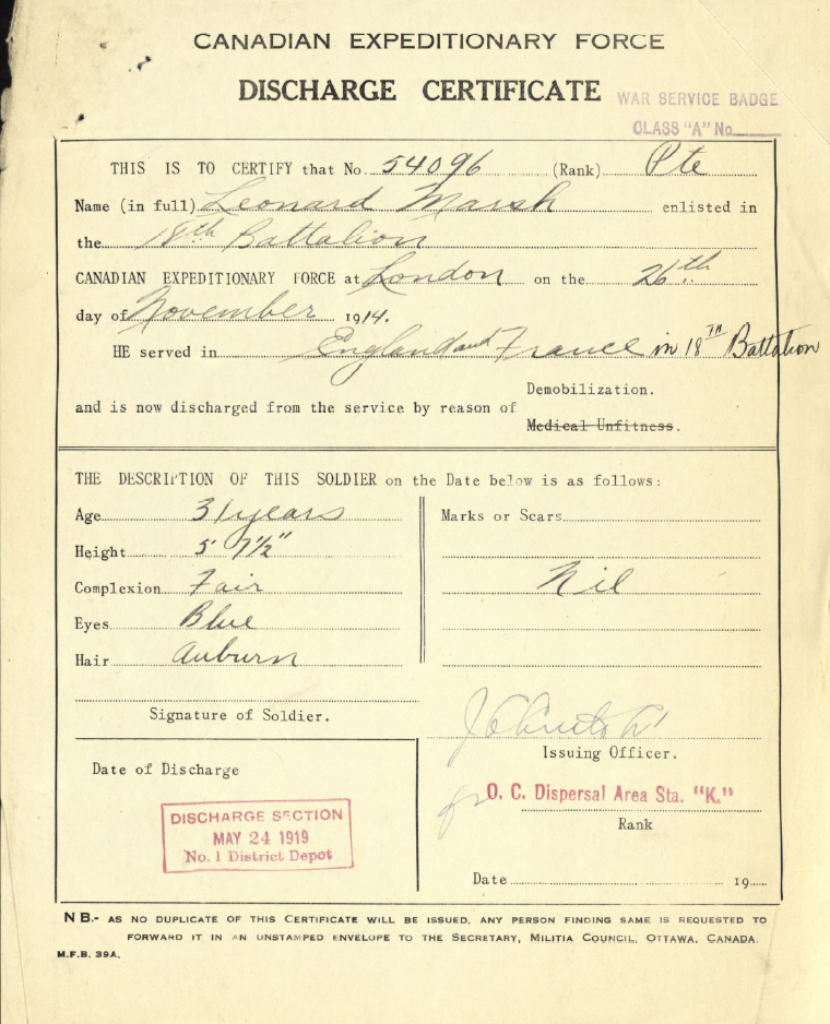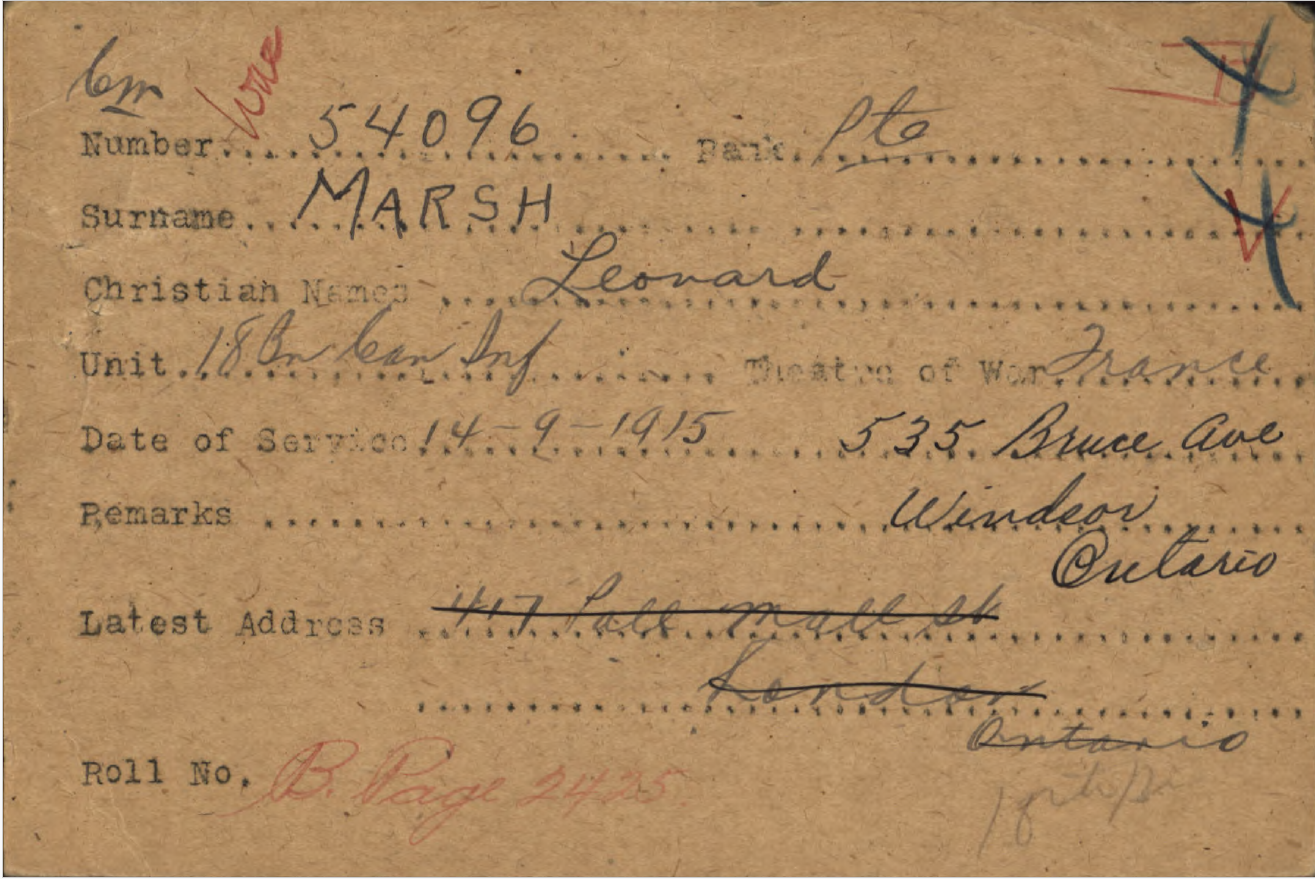 Family Search: Private Leonard Marsh was born on 23 April 1888, in Nottingham, Nottinghamshire, England, United Kingdom as the son of James Marsh and Julia Mary Ann Butler. He immigrated to Canada in 1913 and lived in London, Ontario, Canada in 1919. He registered for military service in 1914. In 1914, at the age of 26, his occupation is listed as labourer. He died in 1971, in Dorset, England, United Kingdom, at the age of 83.