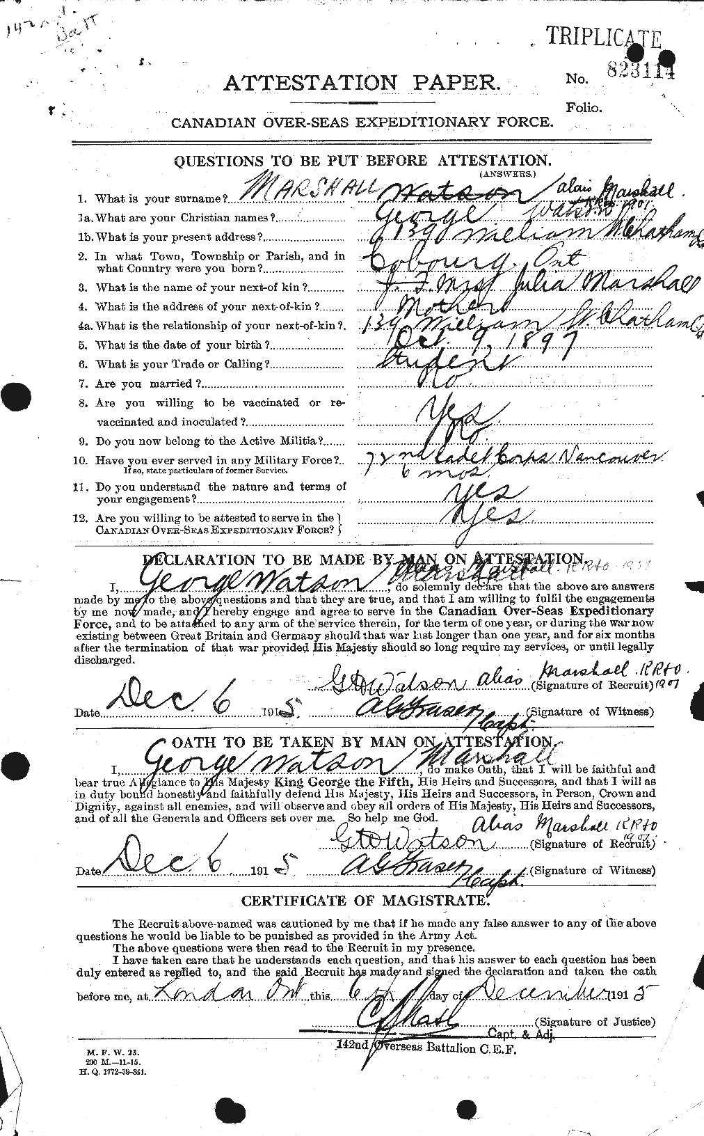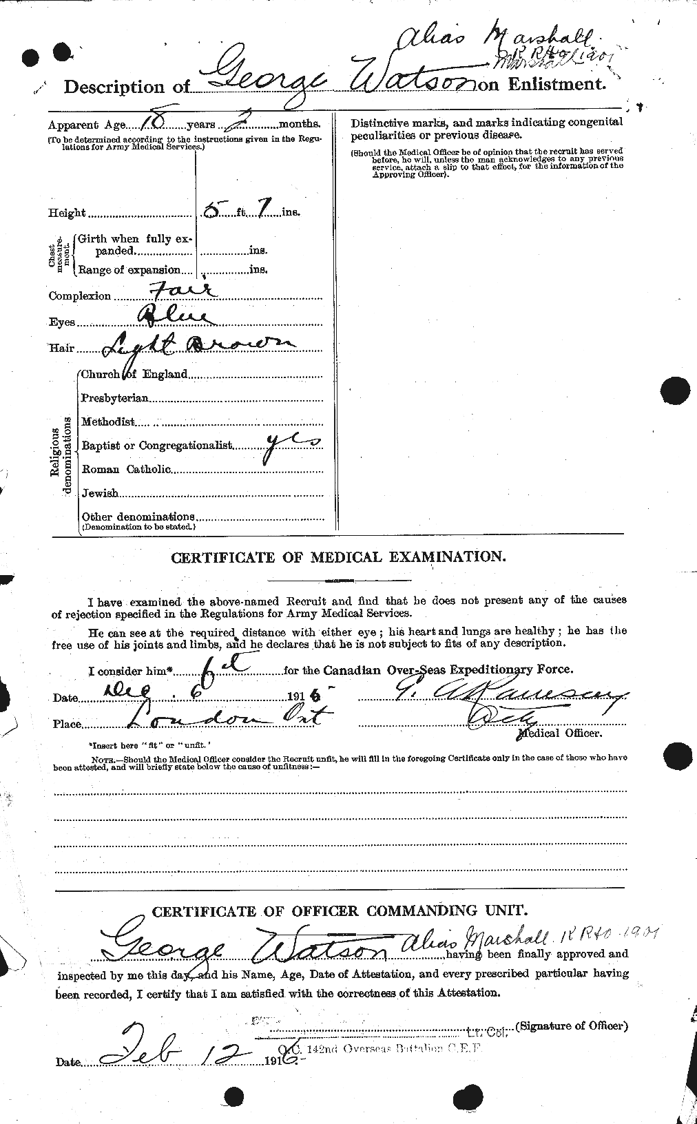 Marshall, George Watson: Service no. 823114 Digitized Service Record Source: Gathering Our Heroes Find-A-Grave Also knows as “George Watson.” Private G.W. Marshall. Source Gathering Our Heroes. Source: Chatham Planet. October 2, 1916. Via Allan Miller post at 18th Battalion Facebook Group. Source: Chatham Planet. February 14, 1917. Via Allan Miller 18th Battalion Facebook Group. Share this: Click to email a link to a friend (Opens in new window) Email Click to share on Facebook (Opens in new window) Facebook Click to share on X (Opens in new window) X Click to share on Reddit (Opens in new window) Reddit Click to share on LinkedIn (Opens in new window) LinkedIn Click to print (Opens in new window) Print Click to share on Tumblr (Opens in new window) Tumblr Click to share on Pocket (Opens in new window) Pocket Click to share on Pinterest (Opens in new window) Pinterest Click to share on Telegram (Opens in new window) Telegram Click to share on WhatsApp (Opens in new window) WhatsApp Like Loading...