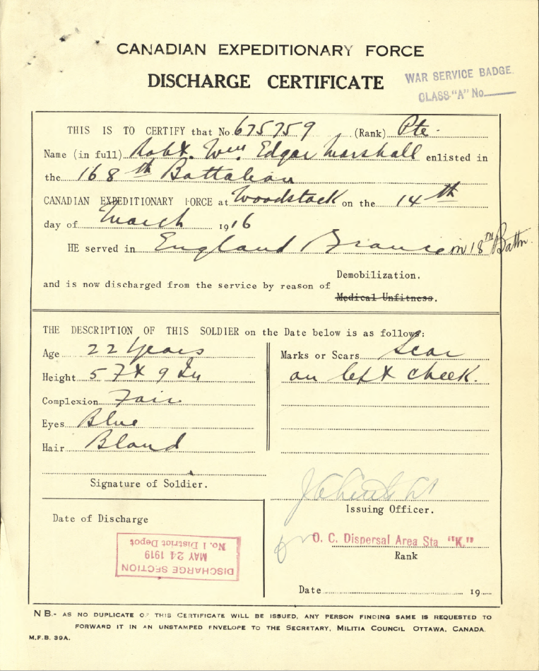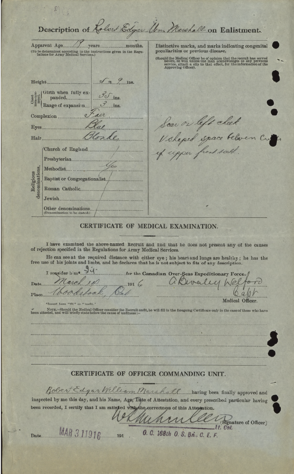Family Search: When Private Robert Edward William Marshall was born on 15 October 1896, in Woodstock, Oxford, Ontario, Canada, his father, Henry Edmund Marshall, was 35 and his mother, Jane Hewett, was 33. He married Grace Evelyn Victoria Cunningham on 24 April 1922, in Woodstock, Oxford, Ontario, Canada. He lived in Oxford, Ontario, Canada for about 10 years. He registered for military service in 1916. In 1916, at the age of 20, his occupation is listed as operator in Woodstock, Oxford, Ontario, Canada. He died in 1968, at the age of 72, and was buried in Hillview Cemetery, Woodstock, Oxford, Ontario, Canada.