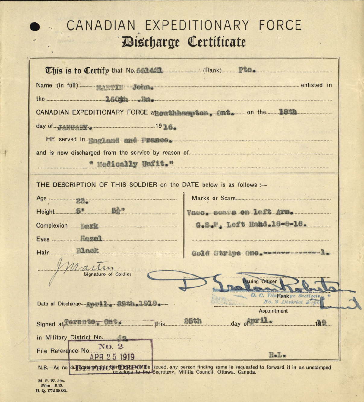 He was discharged as medically unfit and it was noted he had one wound stripe. His discharged occurred at Toronto, Ontario on 25 April 1919.
