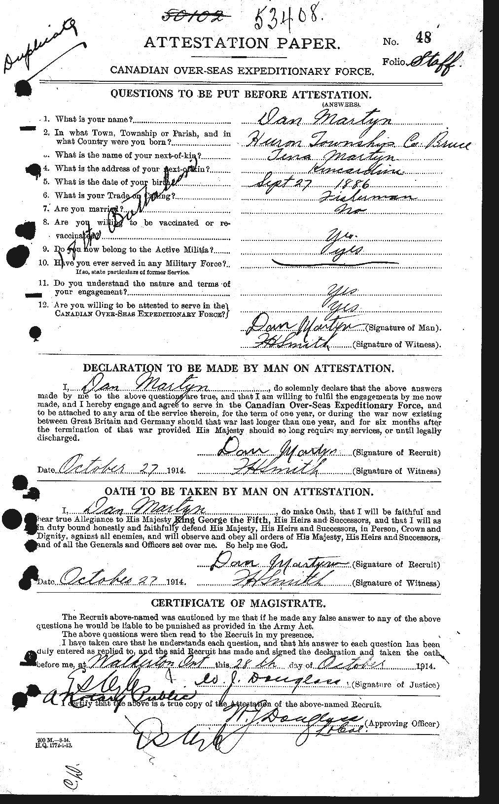 Family Search: Private Daniel Martyn was born on 27 September 1886, in Huron Township, Bruce, Ontario, Canada. He lived in Kincardine, Bruce, Ontario, Canada in 1921. He registered for military service in 1914. In 1914, at the age of 28, his occupation is listed as fisherman.