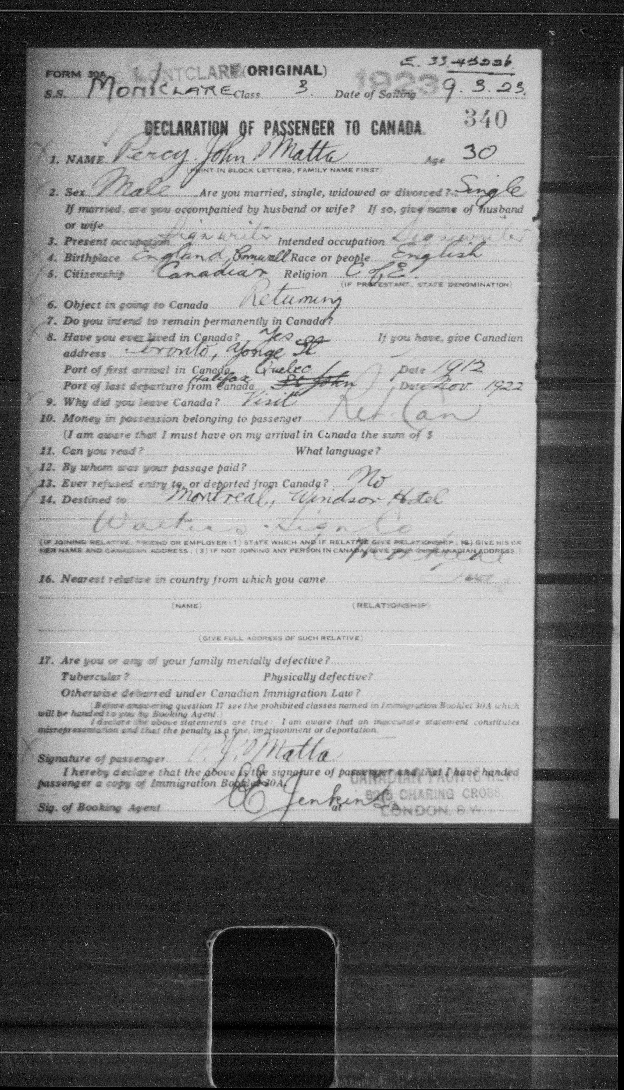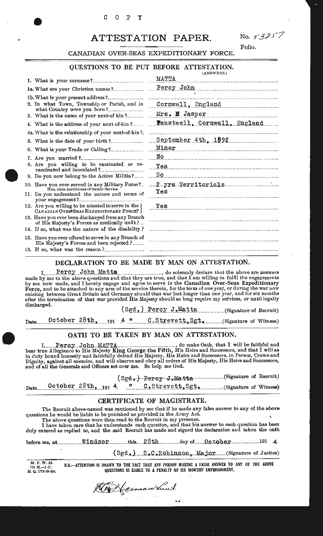 Family Search: Percy John Matta was born on 4 September 1894, in Cornwall, England, United Kingdom as the son of Thomas Josper and Martha Matta. He had at least 1 son with Ellen Beatrice Letourneau. He immigrated to Montreal, Quebec, Canada in 1923. He died on 30 September 1955, in Victoria Park, Victoria, Australia, at the age of 61, and was buried in Ballarat New Cemetery, Ballarat, Victoria, Australia.