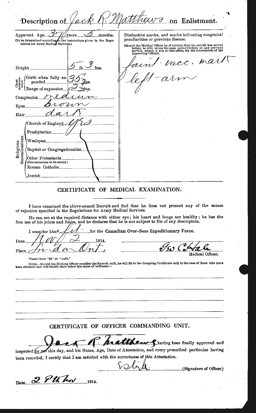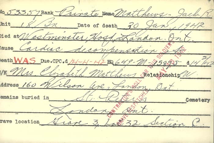 Family Search: When Private Jack Richard Matthews was born on 28 May 1873, in Stratford, Perth, Ontario, Canada, his father, John Richard Matthews, was 26 and his mother, Mary Jane Parkenson, was 21. He married Lillian Elizabeth Wisby on 23 December 1893, in Stratford, Perth, Ontario, Canada. They were the parents of at least 4 sons and 7 daughters. He lived in London, Ontario, Canada West, British Colonial America in 1911. He registered for military service in 1914. In 1914, at the age of 41, his occupation is listed as boilermaker in London, Ontario, Canada. He died on 30 January 1942, in London, Ontario, Canada, at the age of 68, and was buried in St. Peter’s Cemetery, London, Ontario, Canada.