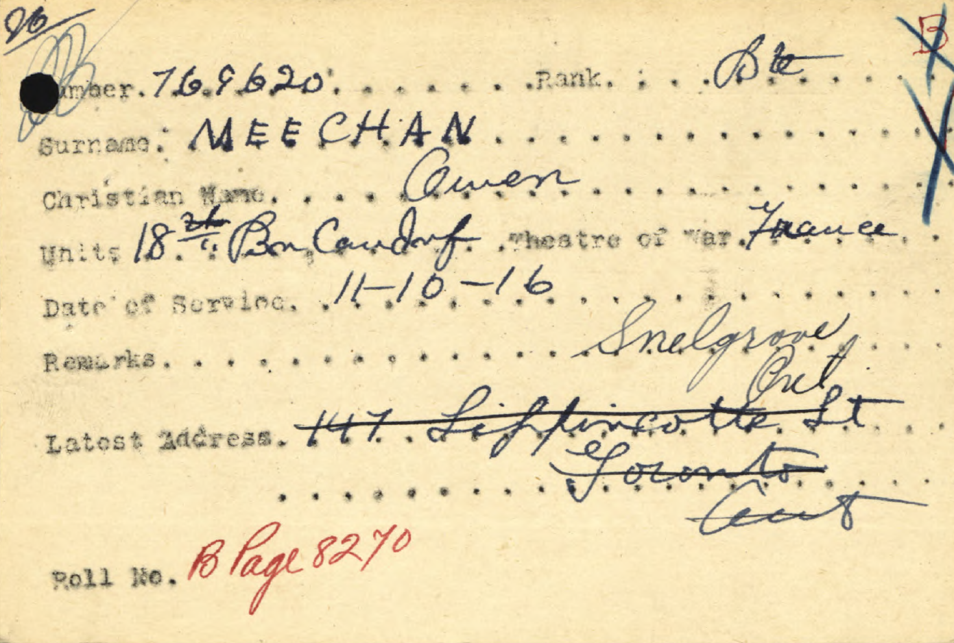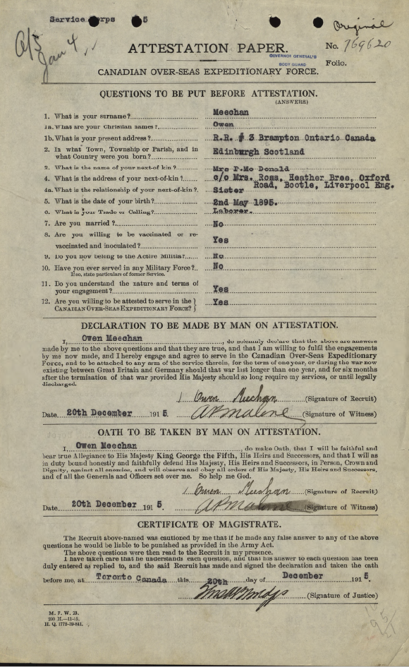 Family Search: Private Norman Matthews was born on 26 June 1892, in Willoughby, Warwickshire, England, United Kingdom as the son of Robert Matthews and Emma. He immigrated to Canada in 1911 and lived in Coventry, Warwickshire, England, United Kingdom in 1911 and Toronto, York, Ontario, Canada in 1915. He registered for military service in 1916. In 1916, at the age of 24, his occupation is listed as farmer in Brampton, Peel, Ontario, Canada.