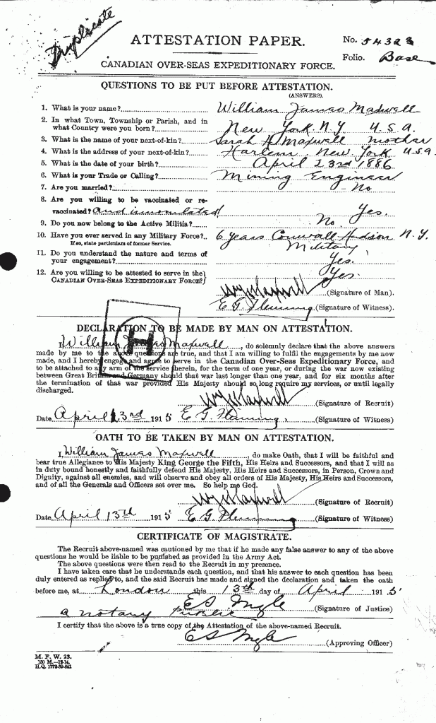 Source: 18th Battalion Nominal Roll, April 1915 during research into how many Americans joined the Battalion.