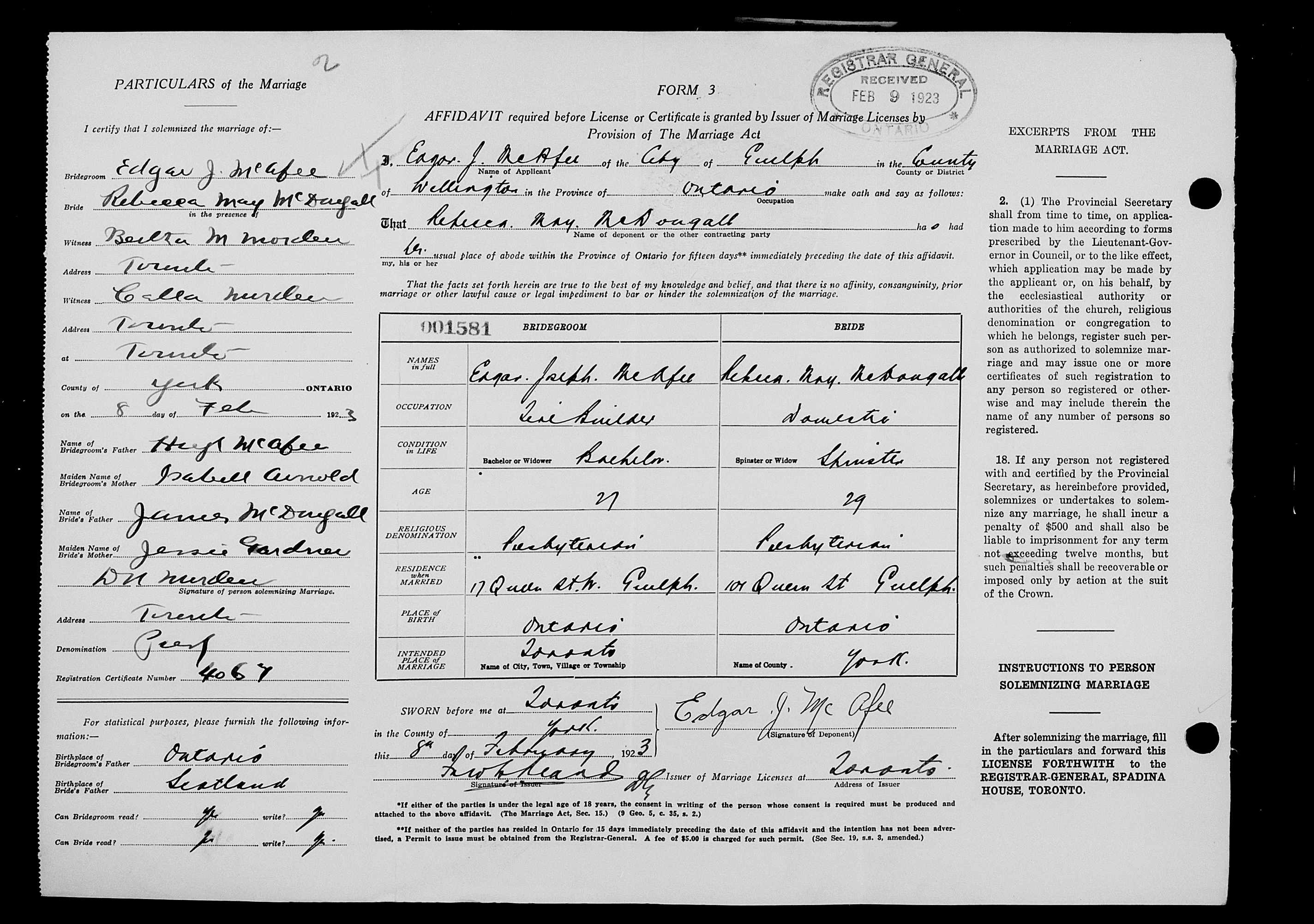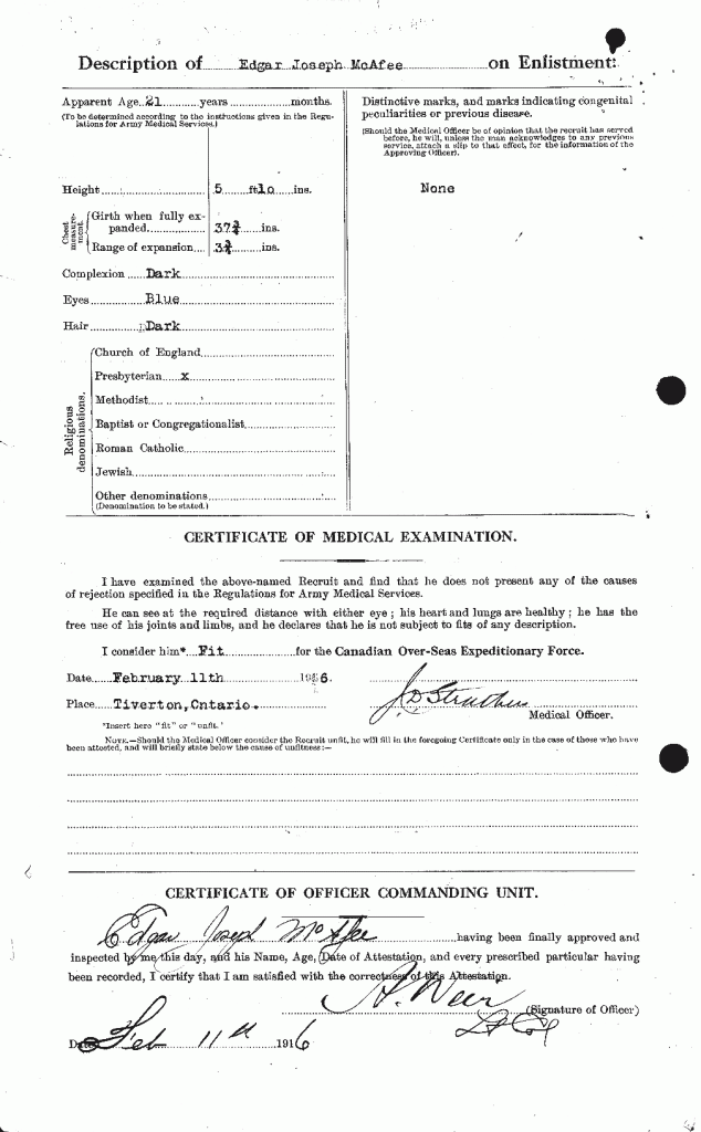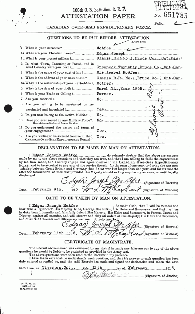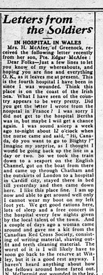 Mrs. H. McAfee of Greenock, received the following letter recently from her son, Pte. Edgar McAfee: