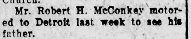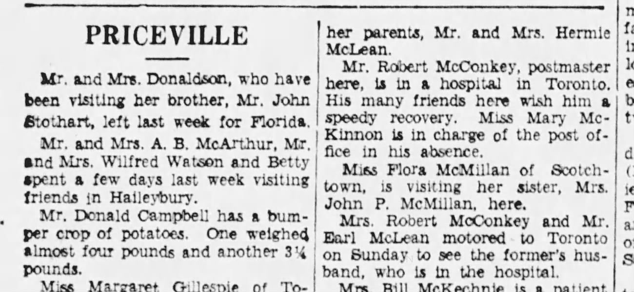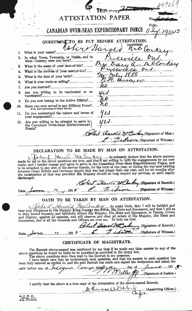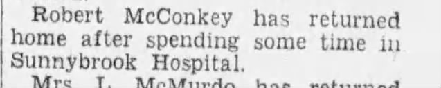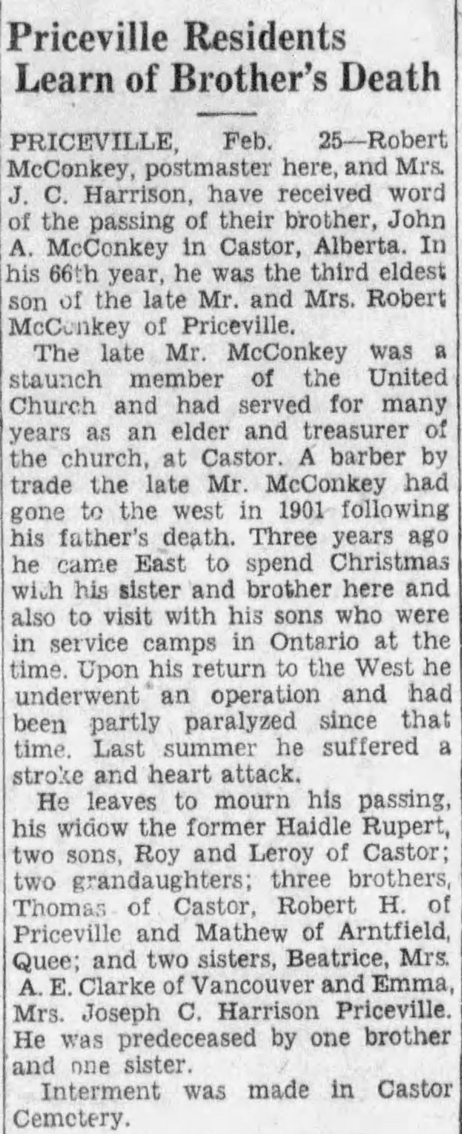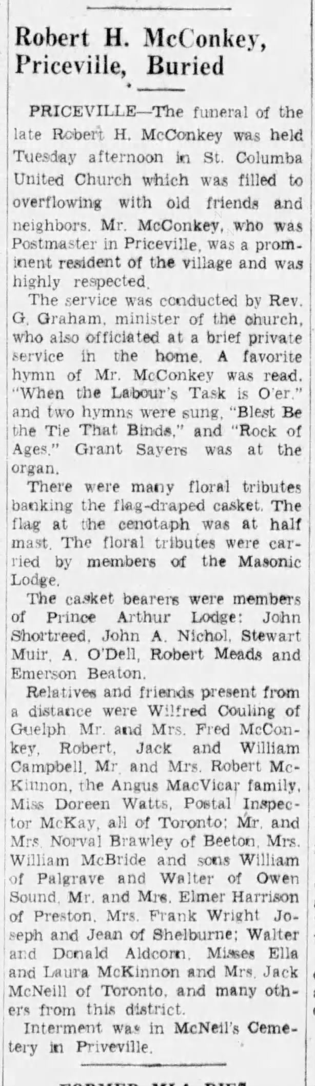 Family Search: When Corporal Robert Harold McConkey was born on 20 July 1888, in Priceville, Grey, Ontario, Canada, his father, Robert John Conkey, was 36 and his mother, Mary Ann Stewart, was 30. He married Anna M. Mullen on 22 August 1921, in Priceville, Ludlow, Northumberland, New Brunswick, Canada. They were the parents of at least 2 sons and 1 daughter. He lived in Grey, Ontario, Canada in 1901 and Artemesia Township, Grey, Ontario, Canada in 1931. He registered for military service in 1915. In 1934, at the age of 46, his occupation is listed as post master in Priceville, Grey, Ontario, Canada. He died on 7 March 1953, in Markdale, Grey, Ontario, Canada, at the age of 64, and was buried in McNeil Cemetery-Priceville, Grey Highlands, Grey, Ontario, Canada.