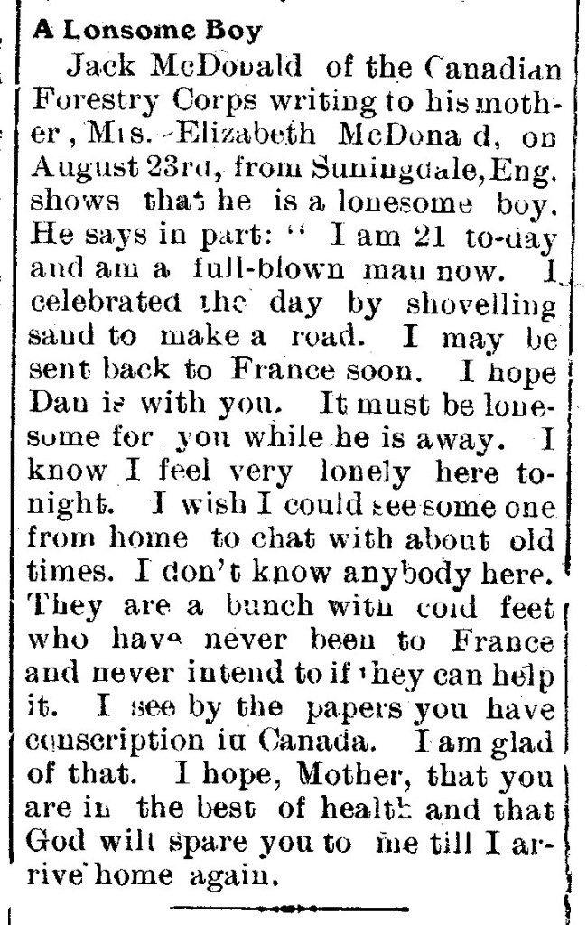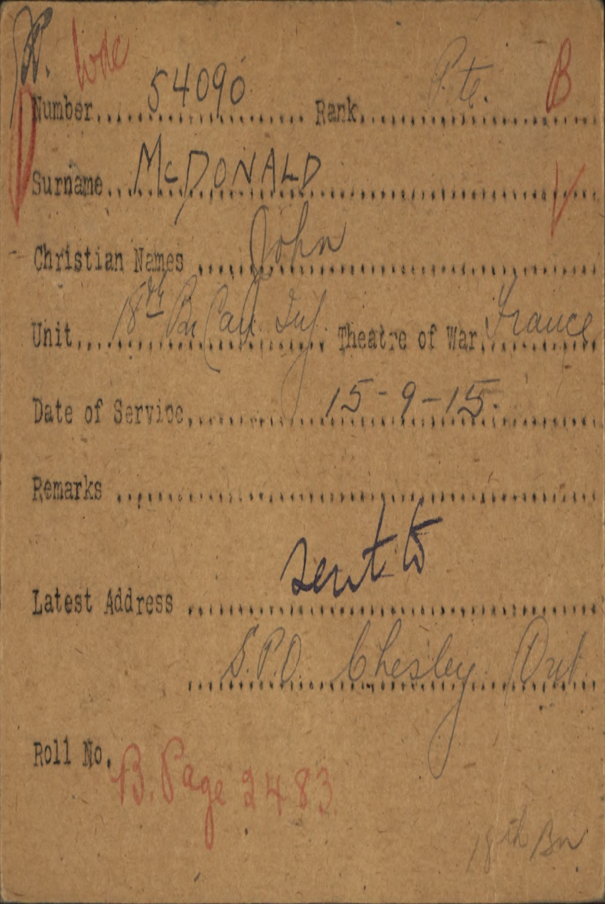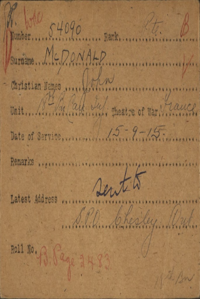 McDonald, John: Service no. 54090 Digitized Service Record Source: Doing search for McDonald, Ronald: Service no. 54035 brothers. Find-A-Grave Chesley Enterprise. September 20, 1917. Share this: Click to email a link to a friend (Opens in new window) Email Click to share on Facebook (Opens in new window) Facebook Click to share on X (Opens in new window) X Click to share on Reddit (Opens in new window) Reddit Click to share on LinkedIn (Opens in new window) LinkedIn Click to print (Opens in new window) Print Click to share on Tumblr (Opens in new window) Tumblr Click to share on Pocket (Opens in new window) Pocket Click to share on Pinterest (Opens in new window) Pinterest Click to share on Telegram (Opens in new window) Telegram Click to share on WhatsApp (Opens in new window) WhatsApp Like Loading...