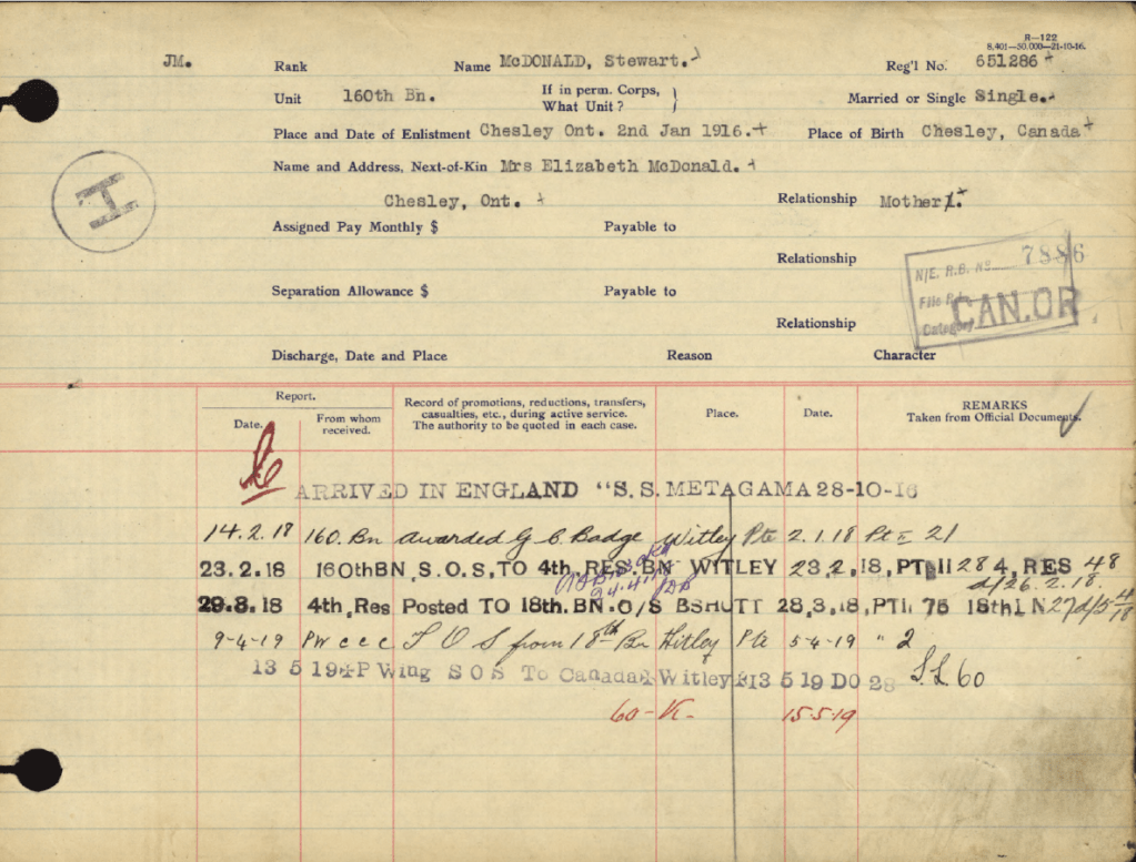 The late Mr. McDonald is survived by his wife, whom he married about four years ago, and two small children, the youngest being about four weeks old. He is also survived by two sisters in Toronto and 2 brothers, one of whom is sailing on the ocean and the other whose whereabouts at present are unknown. He was born in Chesley and spent his entire life here with the exception of the time he served with the 160th Bruce Battalion, dur-ing the Great War, from 1916 to the end of the war. He was a son of the late Mr. and Mrs. Donald McDonald of Chesley.