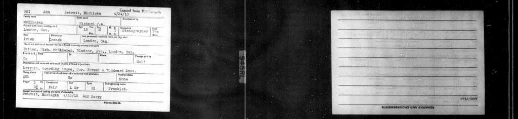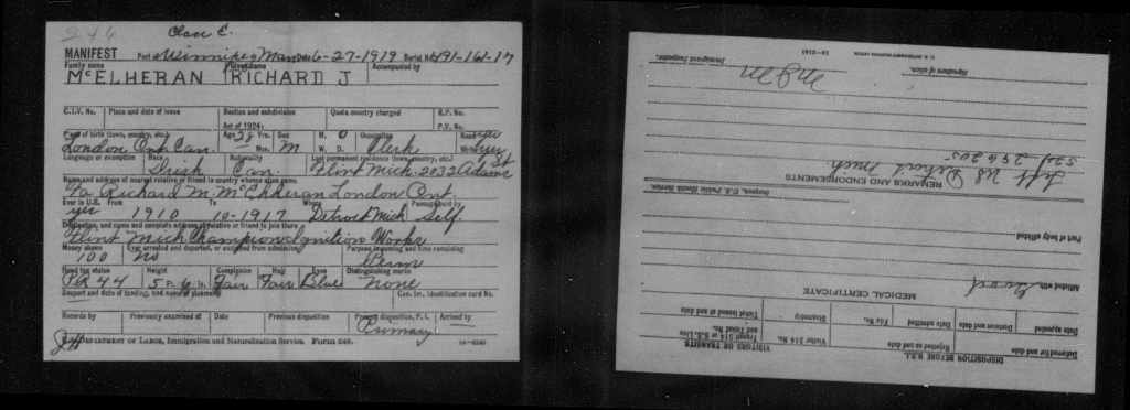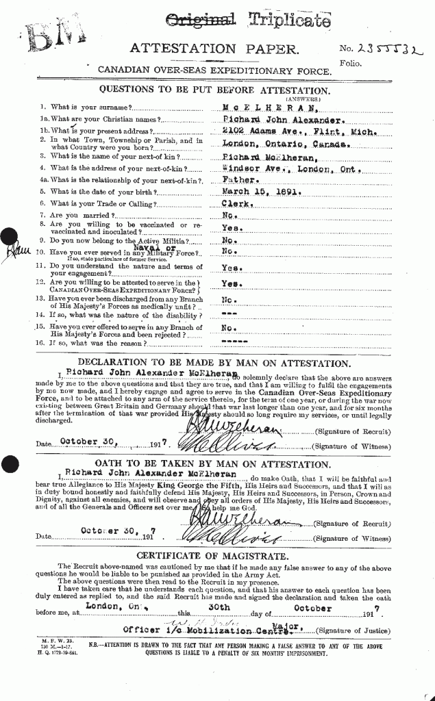 Family Search: Richard John Alexander McElheran was born on 15 March 1891, in London, Ontario, Canada. He married Marguerite Nora Thorne on 11 August 1926, in Detroit, Wayne, Michigan, United States. He lived in Flint, Genesee, Michigan, United States in 1917 and Winnipeg, Manitoba, Canada in 1918. He registered for military service in 1917. In 1917, at the age of 26, his occupation is listed as clerk in Flint, Genesee, Michigan, United States. He died in New Orleans, Orleans, Louisiana, United States, and was buried in Birmingham, Oakland, Michigan, United States.