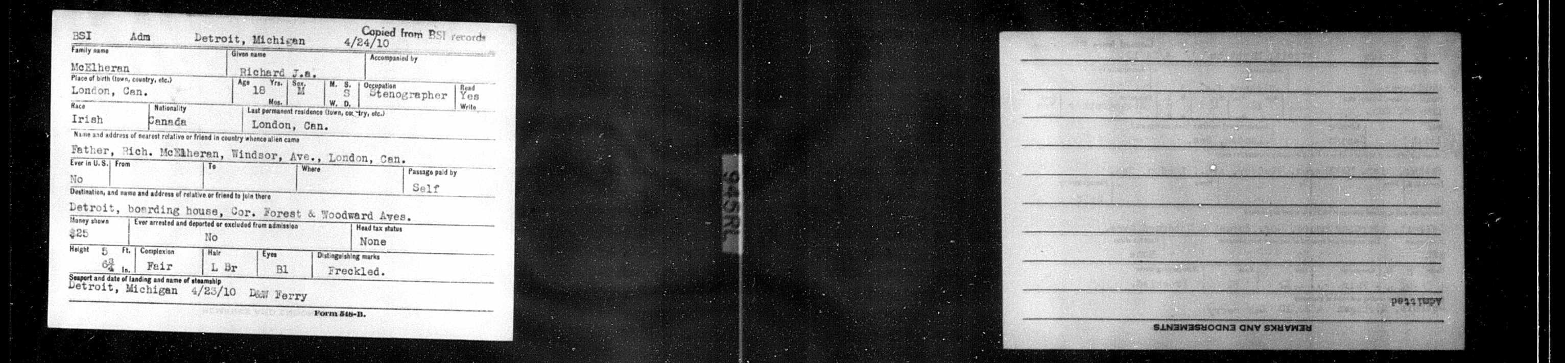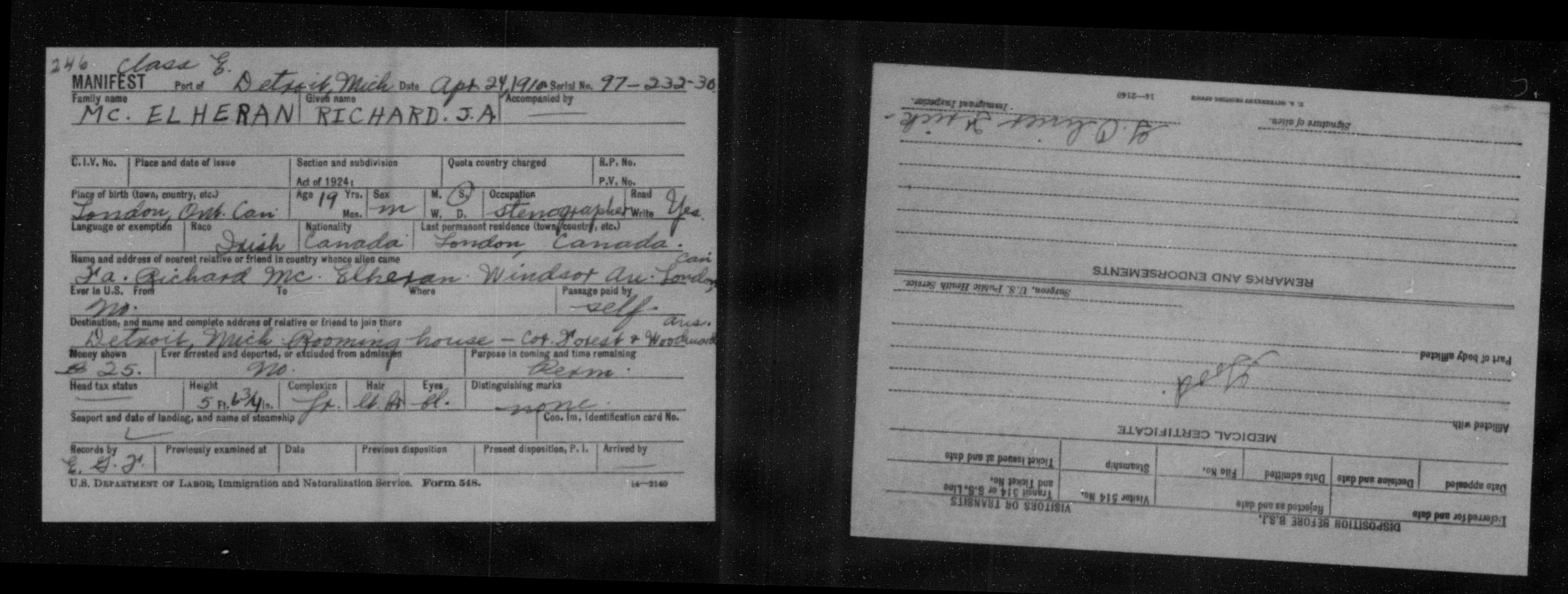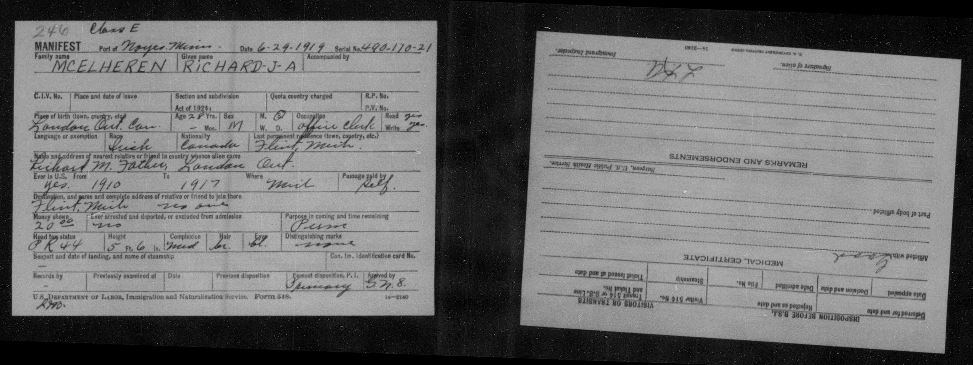 Family Search: Richard John Alexander McElheran was born on 15 March 1891, in London, Ontario, Canada. He married Marguerite Nora Thorne on 11 August 1926, in Detroit, Wayne, Michigan, United States. He lived in Flint, Genesee, Michigan, United States in 1917 and Winnipeg, Manitoba, Canada in 1918. He registered for military service in 1917. In 1917, at the age of 26, his occupation is listed as clerk in Flint, Genesee, Michigan, United States. He died in New Orleans, Orleans, Louisiana, United States, and was buried in Birmingham, Oakland, Michigan, United States.