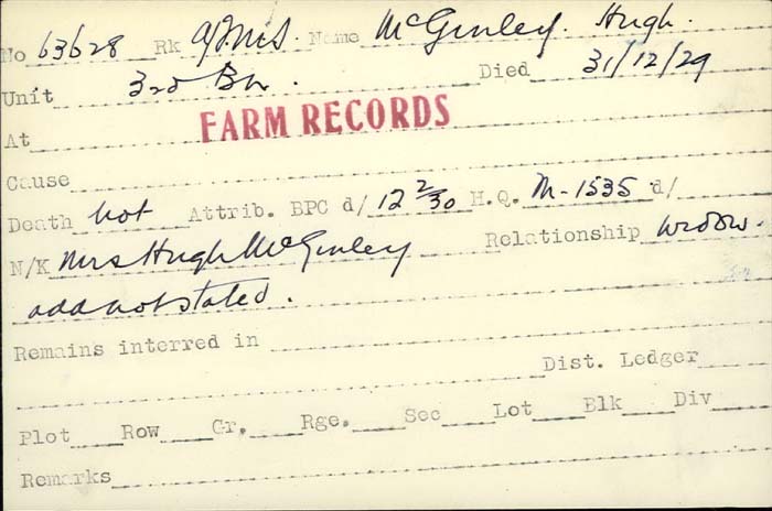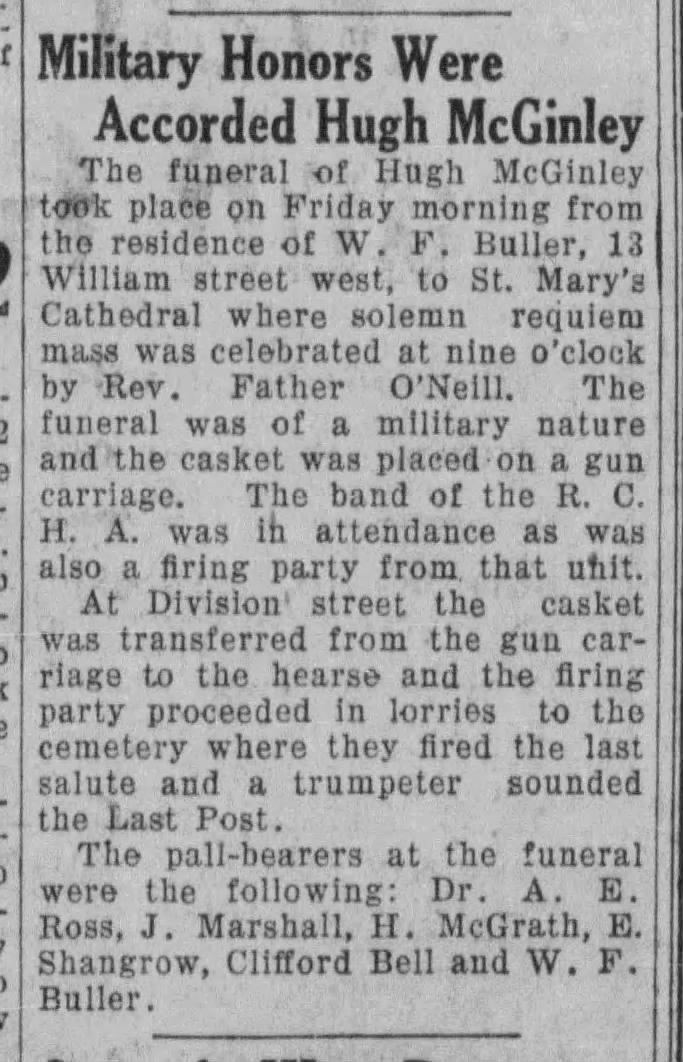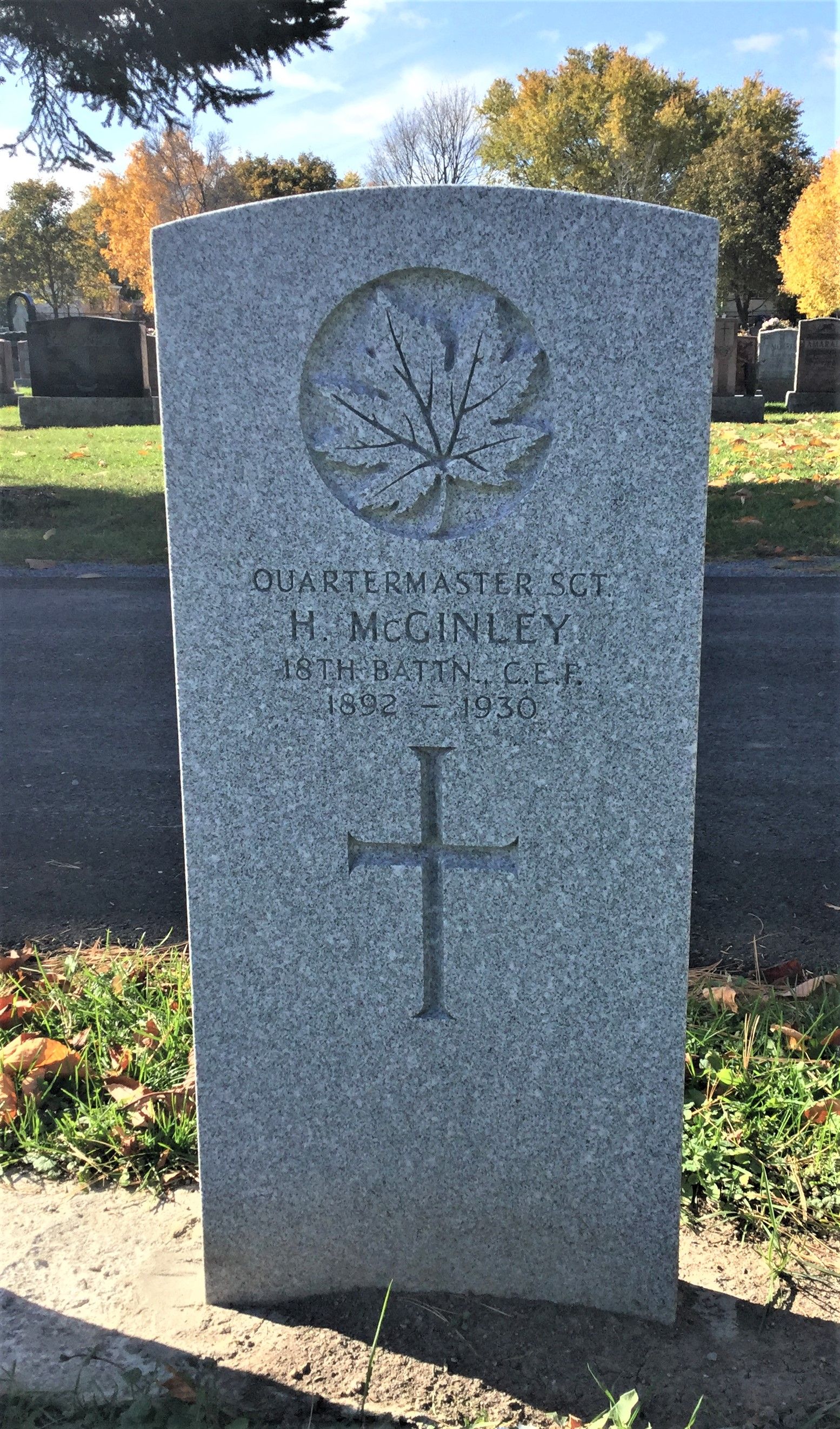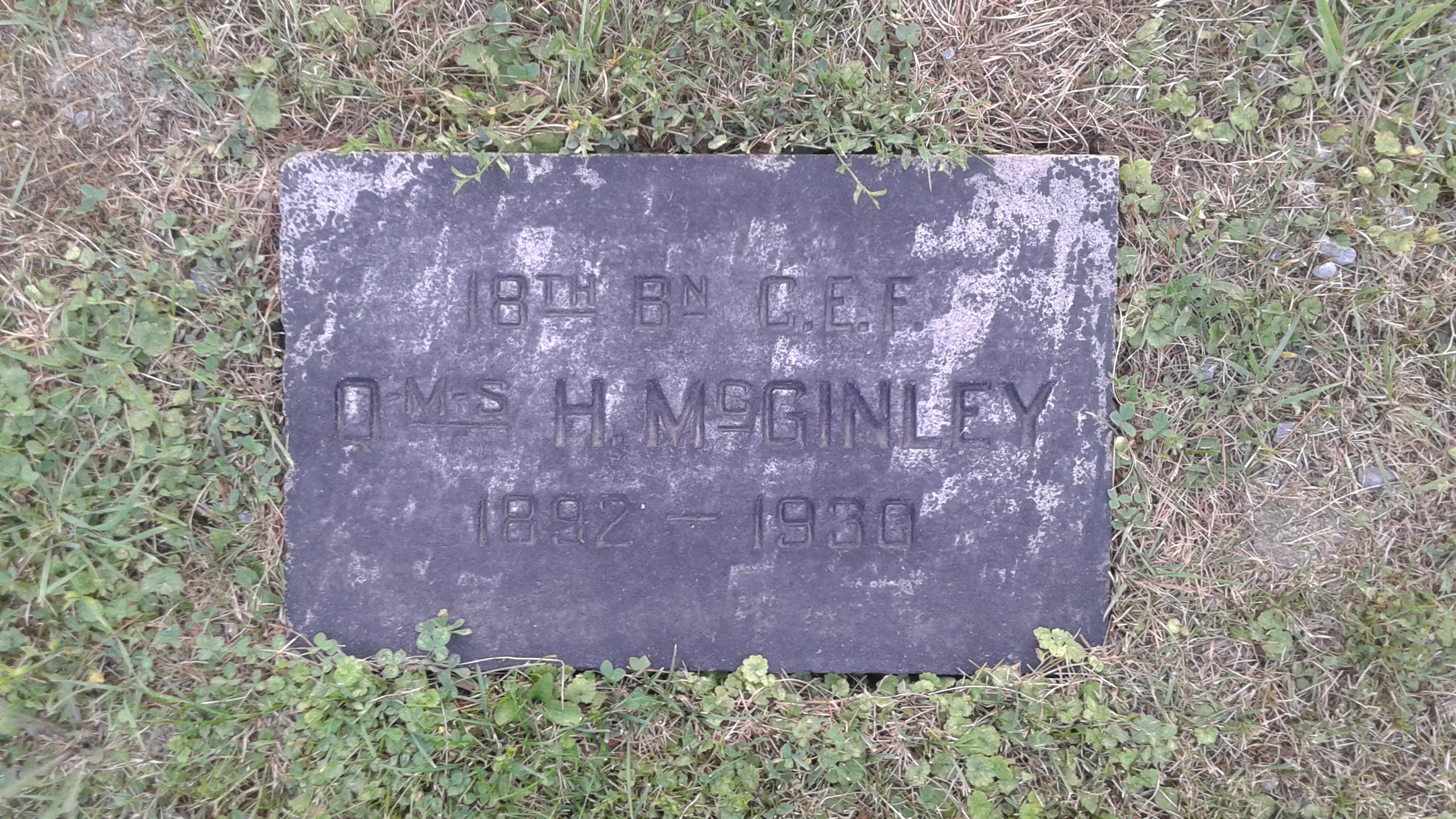 Family Search: Sergeant Hugh McGinley was born on 4 June 1893, in Yorkshire, England, United Kingdom as the son of McGanley and Bridget. He immigrated to Canada in 1914. He registered for military service in 1914. In 1929, at the age of 36, his occupation is listed as pipe fitter in Kingston, Frontenac, Ontario, Canada. He died on 31 December 1929, in Kingston, Frontenac, Ontario, Canada, at the age of 36, and was buried in Saint Marys Roman Catholic Cemetery, Kingston, Frontenac, Ontario, Canada.
