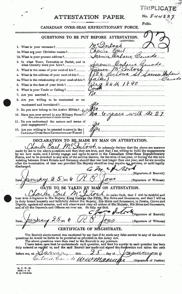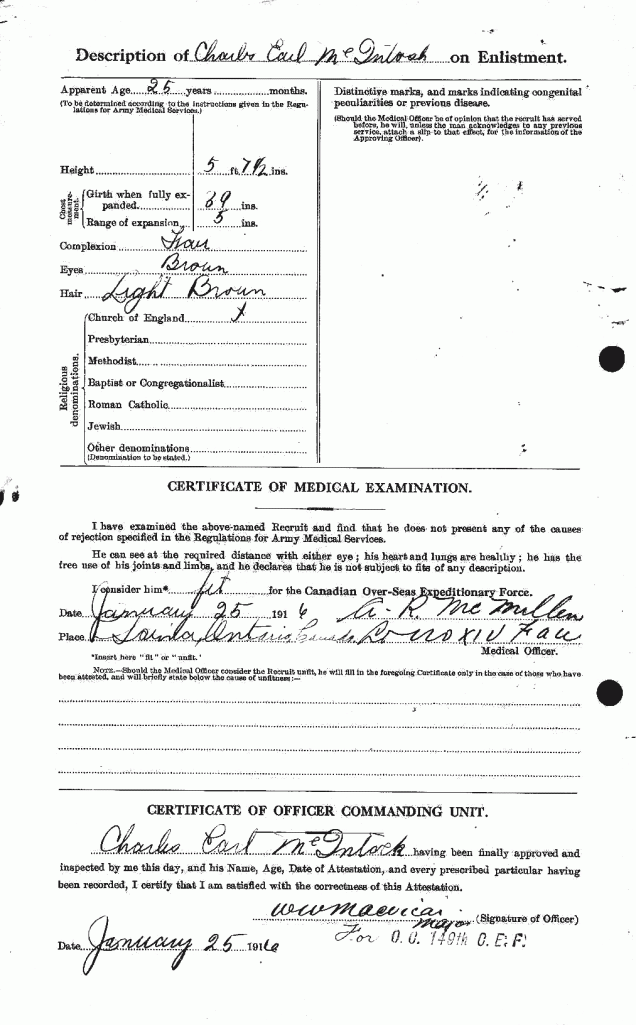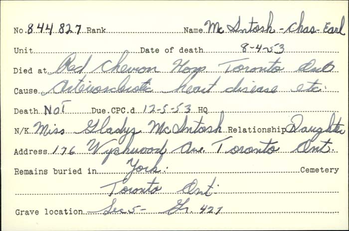Family Search: When Private Charles Earl McIntosh was born on 24 August 1889, in Sarnia, Lambton, Ontario, Canada, his father, James Mason McIntosh, was 39 and his mother, Elizabeth Stevenson, was 33. He had at least 2 daughters with Eleanor Sara Fuller. He lived in Lambton, Ontario, Canada for about 10 years. He registered for military service in 1916. In 1916, at the age of 27, his occupation is listed as cook in Sarnia, Lambton, Ontario, Canada. He died on 8 April 1953, in Toronto, Ontario, Canada, at the age of 63, and was buried in York Cemetery, Toronto, Ontario, Canada.