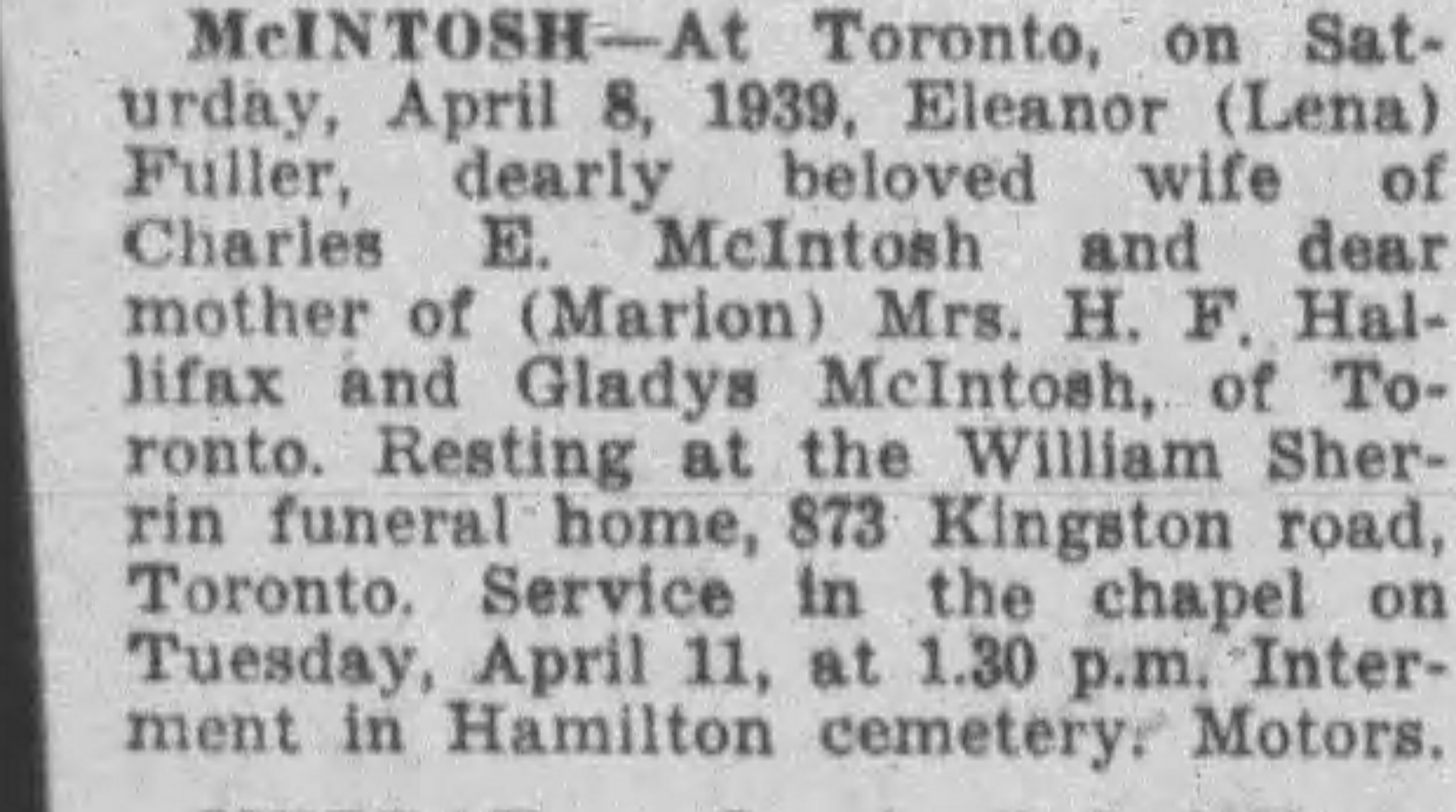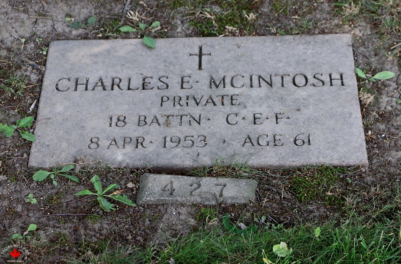 Family Search: When Private Charles Earl McIntosh was born on 24 August 1889, in Sarnia, Lambton, Ontario, Canada, his father, James Mason McIntosh, was 39 and his mother, Elizabeth Stevenson, was 33. He had at least 2 daughters with Eleanor Sara Fuller. He lived in Lambton, Ontario, Canada for about 10 years. He registered for military service in 1916. In 1916, at the age of 27, his occupation is listed as cook in Sarnia, Lambton, Ontario, Canada. He died on 8 April 1953, in Toronto, Ontario, Canada, at the age of 63, and was buried in York Cemetery, Toronto, Ontario, Canada.