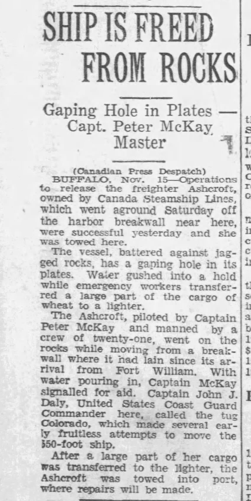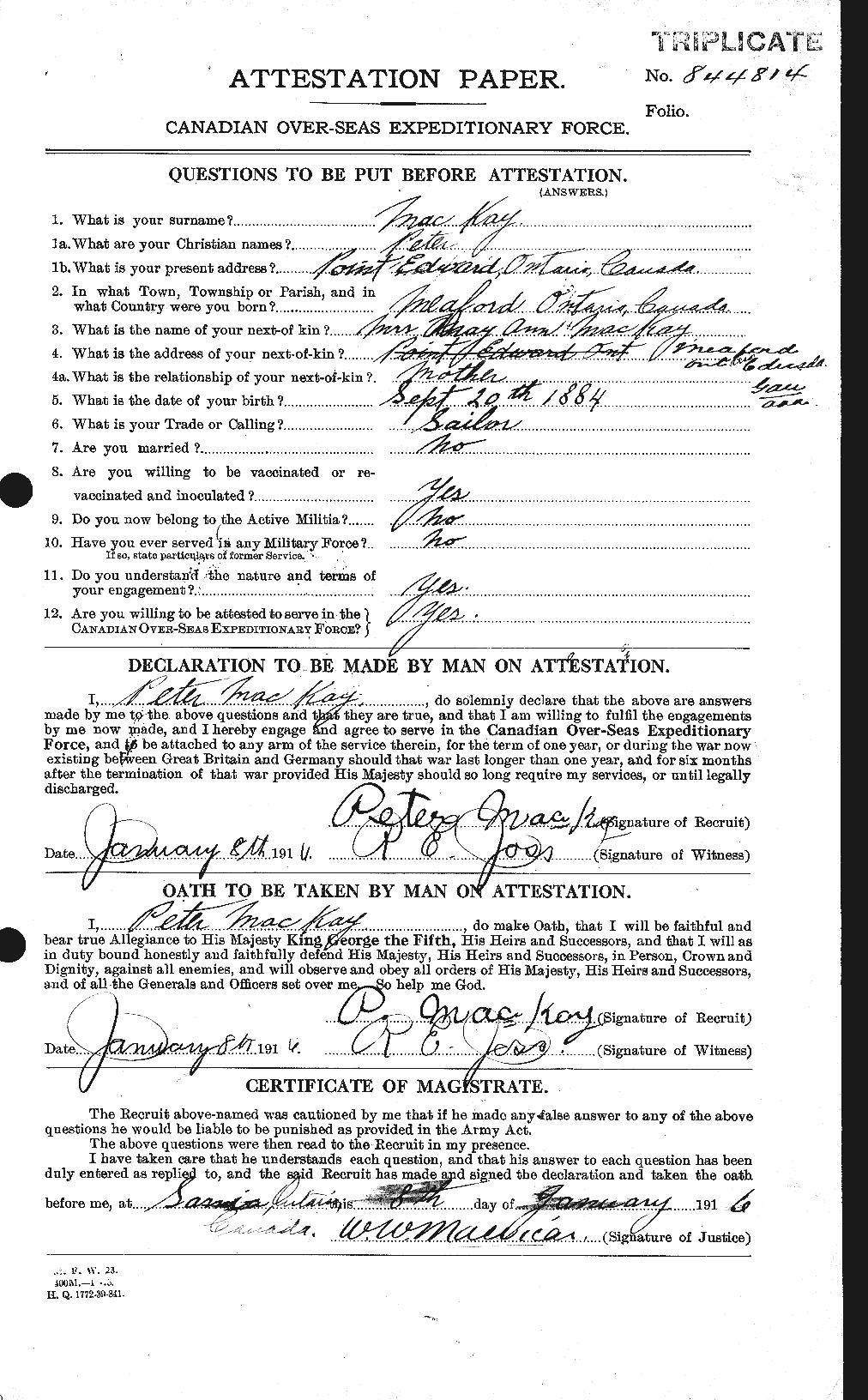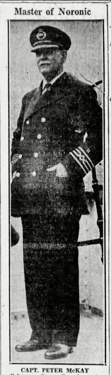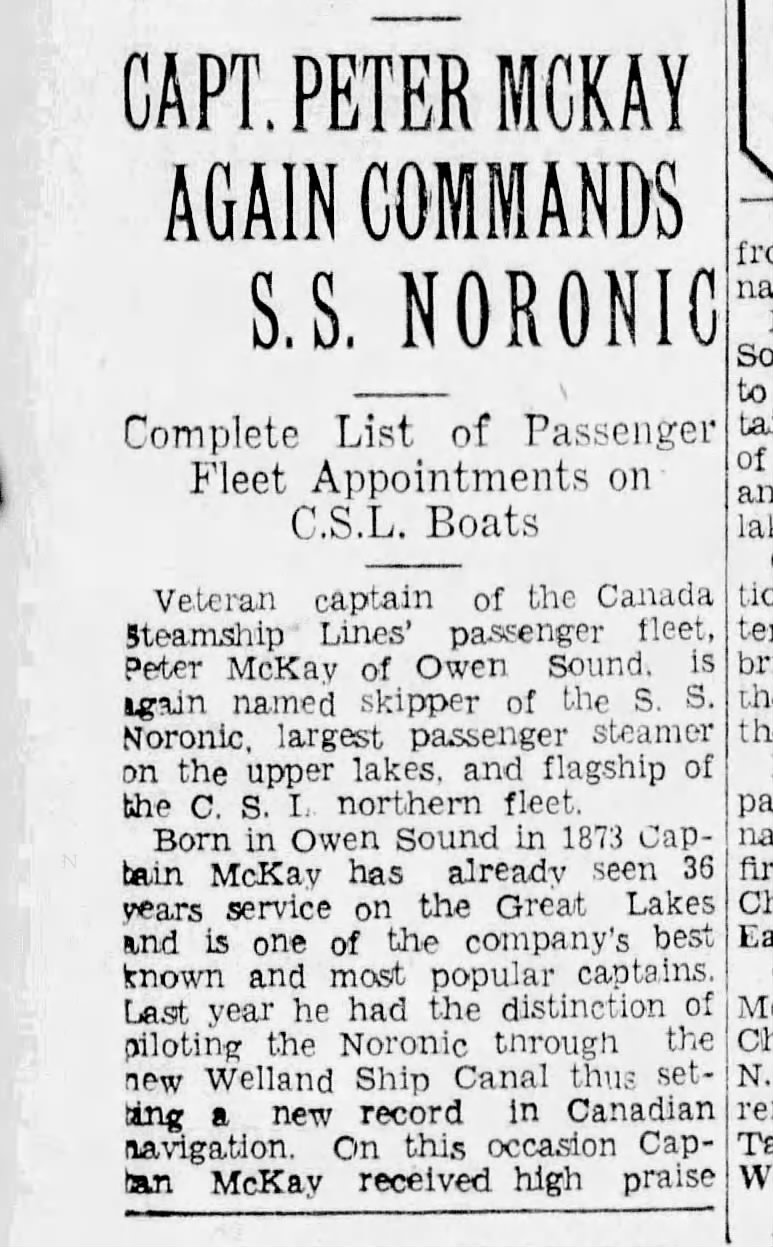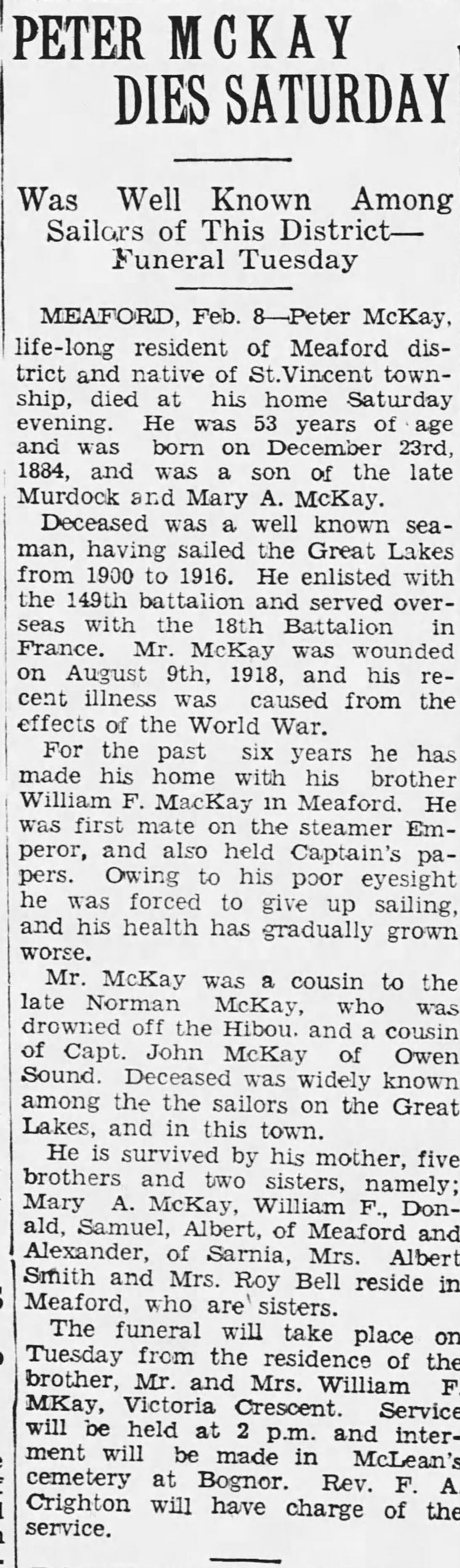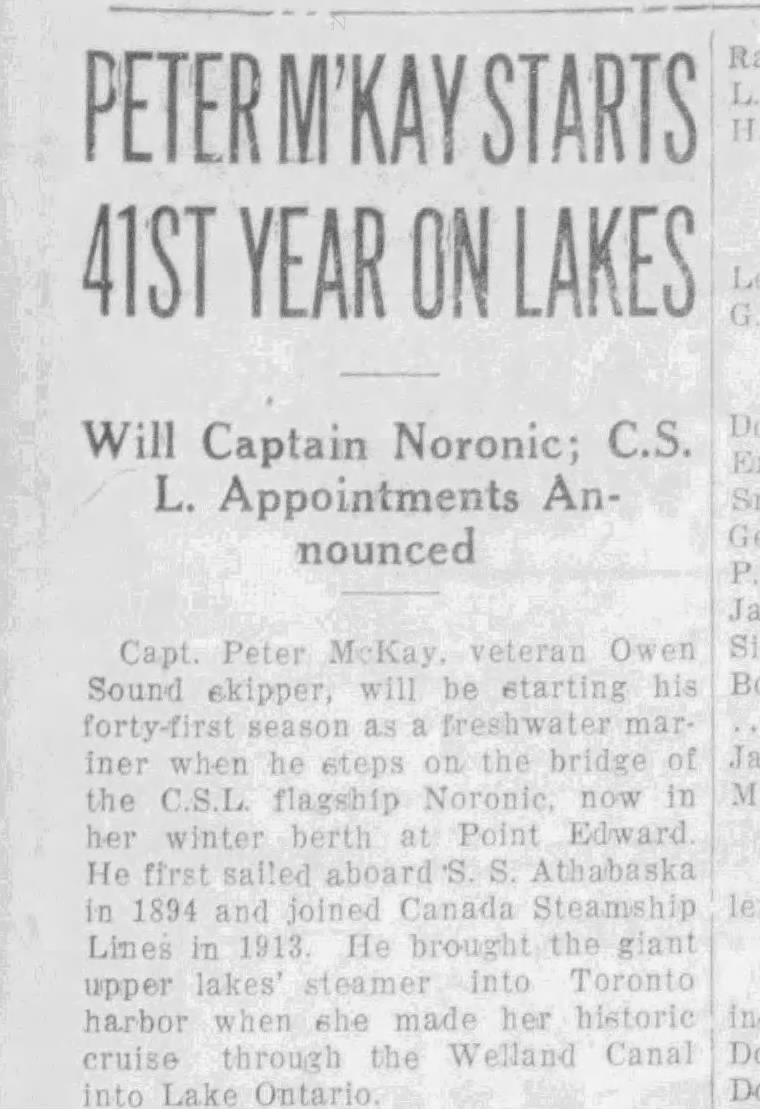 Family Search: When Captain Peter McKay was born on 23 December 1884, in St. Vincent Township, Grey, Ontario, Canada, his father, Murdock McKay, was 27 and his mother, Mary Ann Latimer, was 25. He immigrated to Superior, Douglas, Wisconsin, United States in 1922 and lived in Grey, Ontario, Canada in 1911 and Point Edward, Lambton, Ontario, Canada in 1916. He registered for military service in 1916. In 1916, at the age of 32, his occupation is listed as sailor in Point Edward, Lambton, Ontario, Canada. He died on 6 February 1937, in Meaford, Grey, Ontario, Canada, at the age of 52, and was buried in McLean’s Cemetery, Bognor, Simcoe, Canada West, British North America.