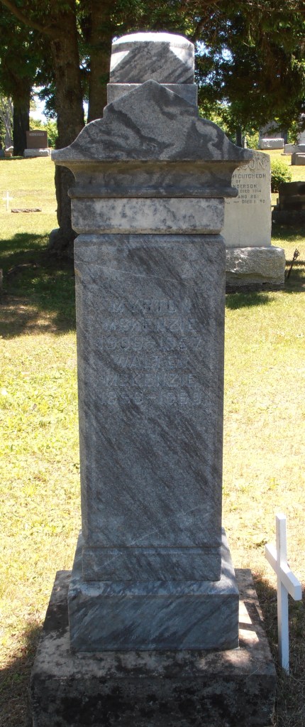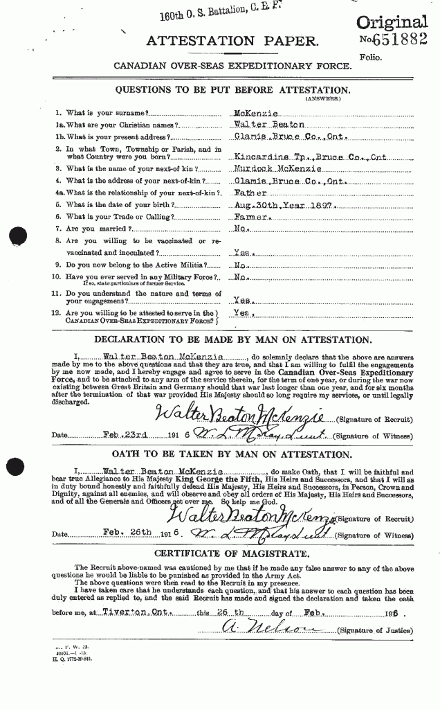 Family Search: When Walter Beaton McKenzie was born on 30 August 1896, in Kincardine, Bruce, Ontario, Canada, his father, Murdock McKenzie, was 35 and his mother, Catherine Anne McLeod, was 32. He lived in Bruce, Ontario, Canada in 1911 and Glammis, Bruce, Ontario, Canada in 1916. He registered for military service in 1916. In 1916, at the age of 20, his occupation is listed as farmer. He died on 18 February 1960, in Toronto, York, Ontario, Canada, at the age of 63, and was buried in Kincardine, Bruce, Ontario, Canada.