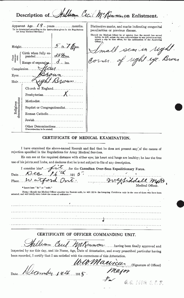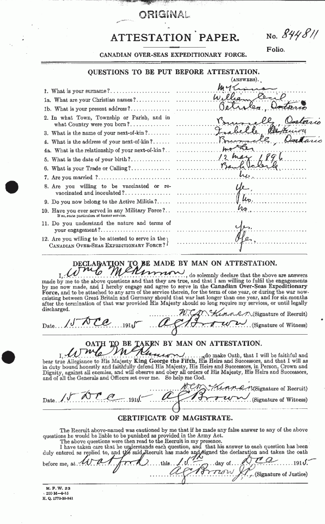 Family Search: When William Cecil Mckinnon was born on 12 May 1896, in Brussels, Huron, Ontario, Canada, his father, Hugh Mckinnon, was 51 and his mother, Isabella McKay, was 36. He lived in Huron, Ontario, Canada for about 10 years and Toronto, York, Ontario, Canada in 1921. He registered for military service in 1915. In 1915, at the age of 19, his occupation is listed as bank clerk, bank of nova scotia in Brigden, St. Clair, Lambton, Ontario, Canada.