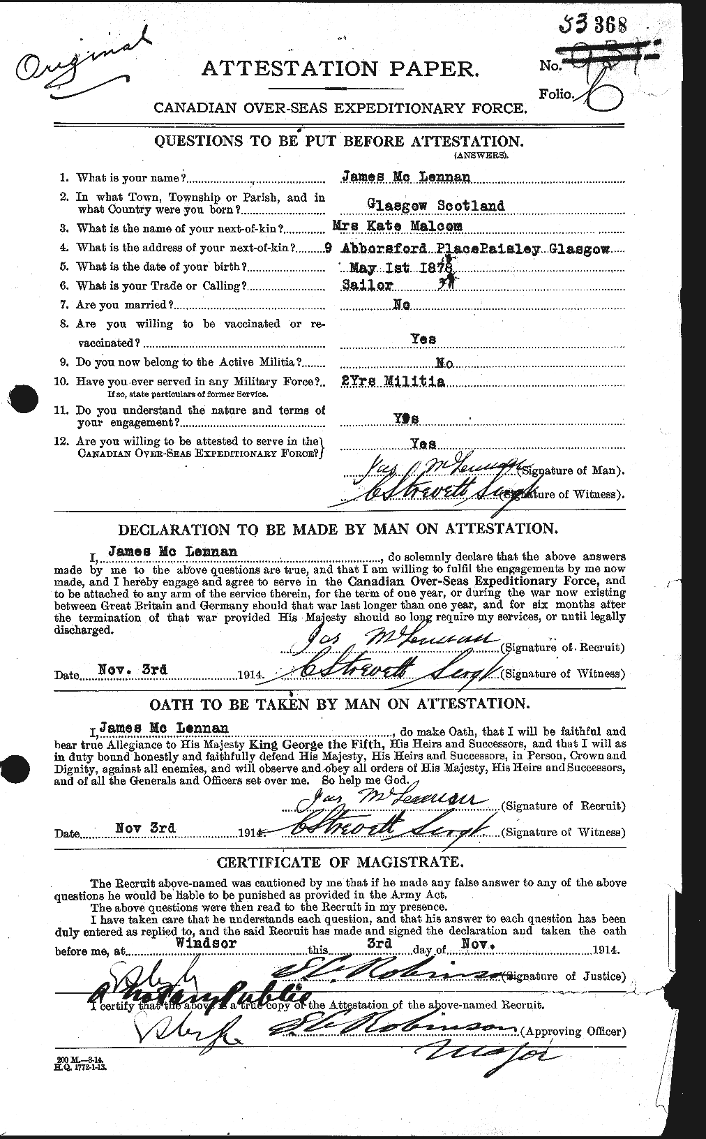This 36-year old sailor enlisted with the 18th Battalion on November 3, 1914. He went overseas with the 18th Battalion late April 1915, arriving for active duty on the Continent on September 15, 1915.