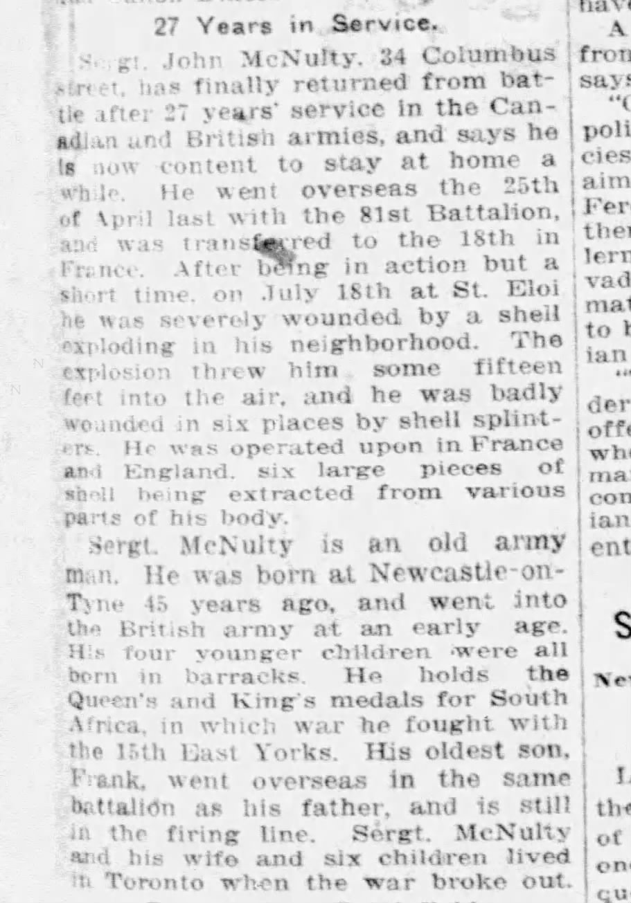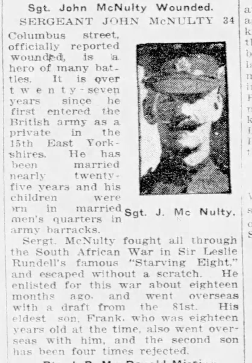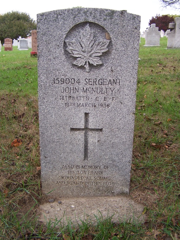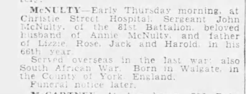 Family Search: When Sergeant John McNulty was born on 17 November 1871, in Newcastle upon Tyne, Tyne and Wear, England, United Kingdom, his father, Patrick John McNulty, was 22 and his mother, Elizabeth Lilly, was 23. He married Annie Dean in 1896. They were the parents of at least 3 sons and 3 daughters. He immigrated to Canada in 1911 and lived in Sale, Cheshire, England, United Kingdom, in 1911 and in Toronto, York, Ontario, Canada in 1921. He registered for military service in 1915. In 1915, at the age of 44, his occupation is listed as laundry marker, Parisian laundry in Toronto, York, Ontario, Canada. He died on 19 March 1936, in Toronto, Ontario, Canada, at the age of 64, and was buried in Mount Hope Catholic Cemetery, Toronto, Ontario, Canada.