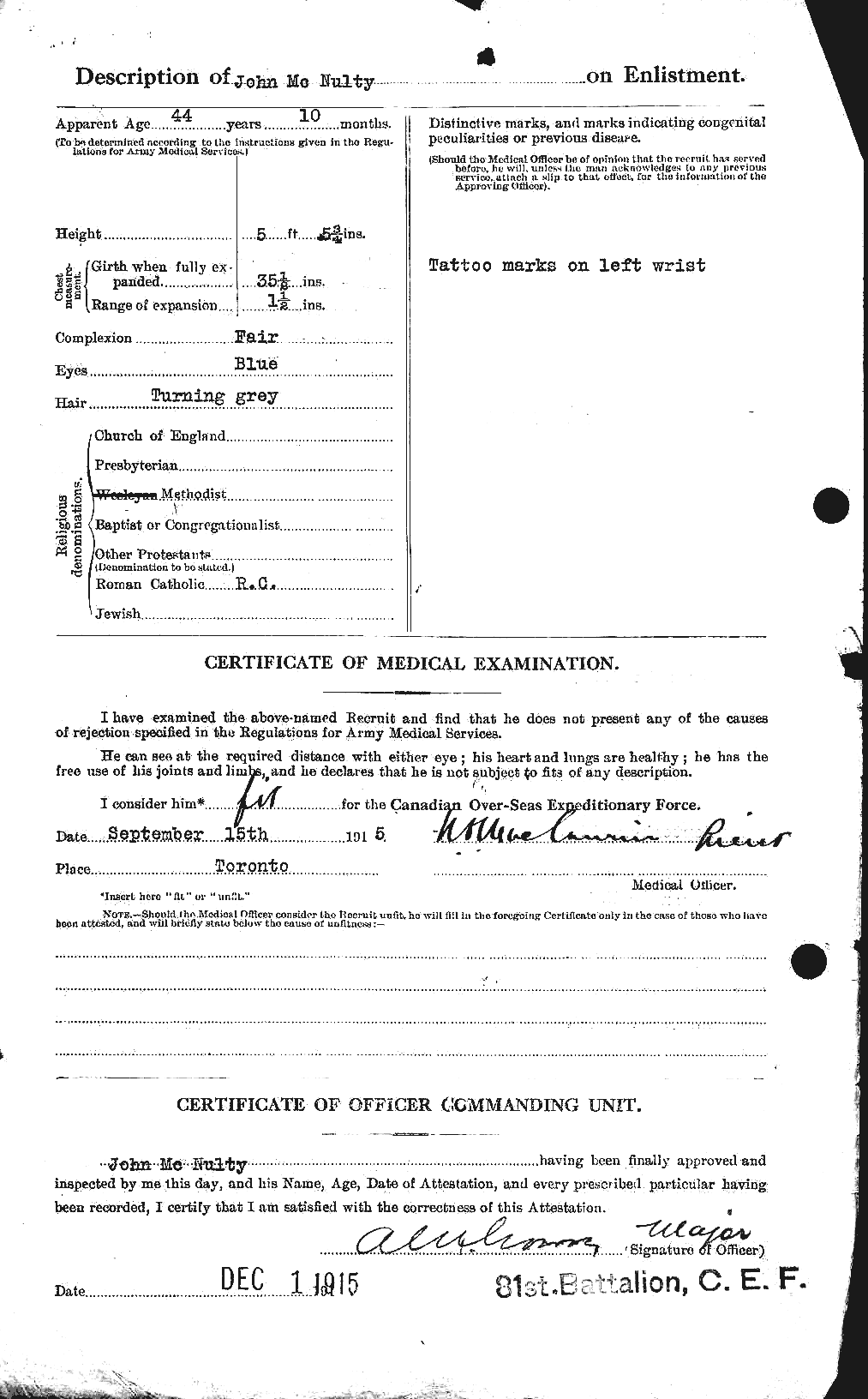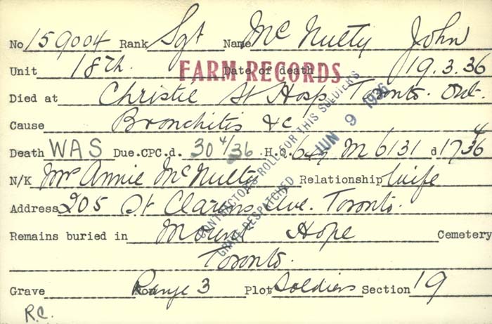 Family Search: When Sergeant John McNulty was born on 17 November 1871, in Newcastle upon Tyne, Tyne and Wear, England, United Kingdom, his father, Patrick John McNulty, was 22 and his mother, Elizabeth Lilly, was 23. He married Annie Dean in 1896. They were the parents of at least 3 sons and 3 daughters. He immigrated to Canada in 1911 and lived in Sale, Cheshire, England, United Kingdom, in 1911 and in Toronto, York, Ontario, Canada in 1921. He registered for military service in 1915. In 1915, at the age of 44, his occupation is listed as laundry marker, Parisian laundry in Toronto, York, Ontario, Canada. He died on 19 March 1936, in Toronto, Ontario, Canada, at the age of 64, and was buried in Mount Hope Catholic Cemetery, Toronto, Ontario, Canada.