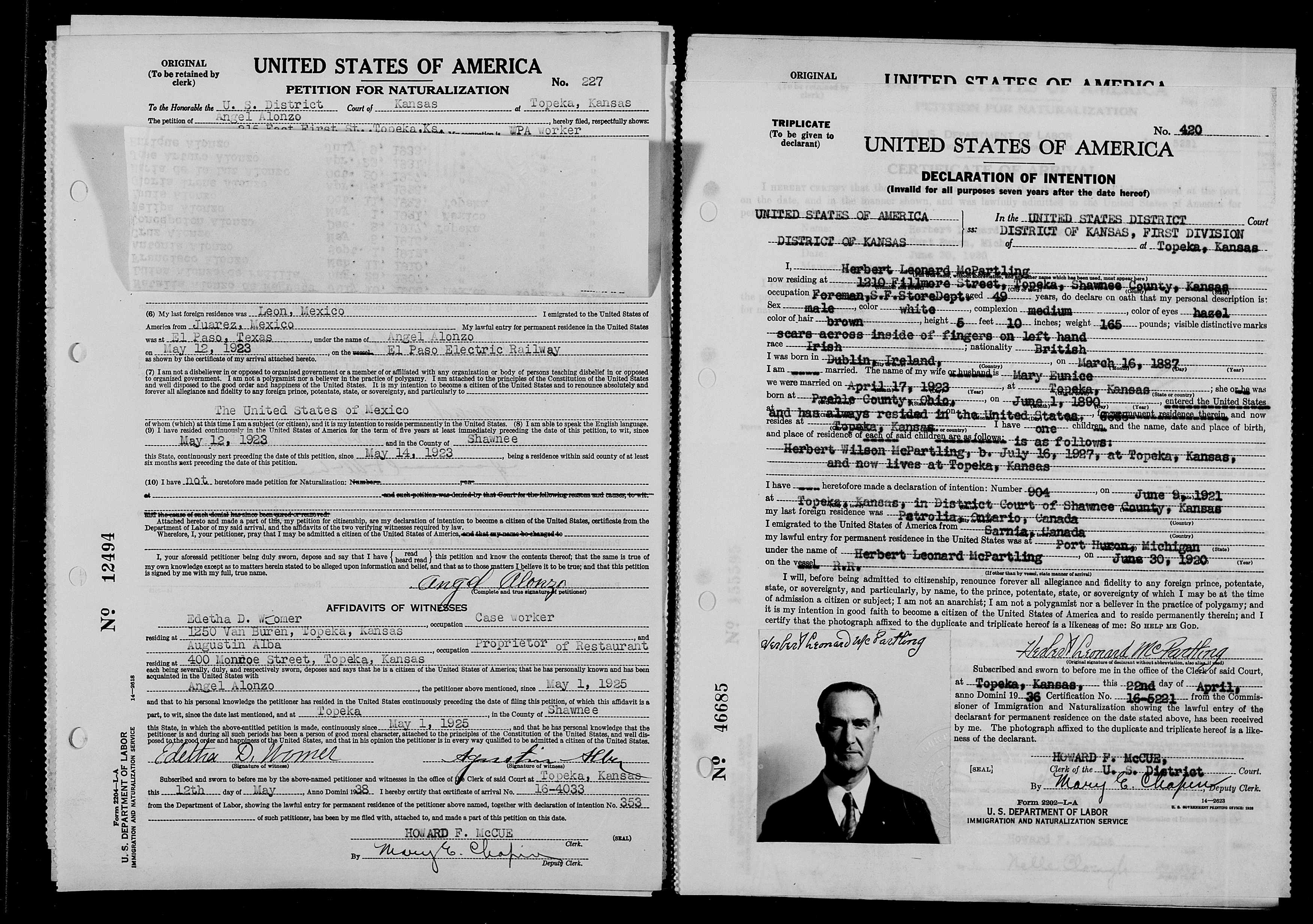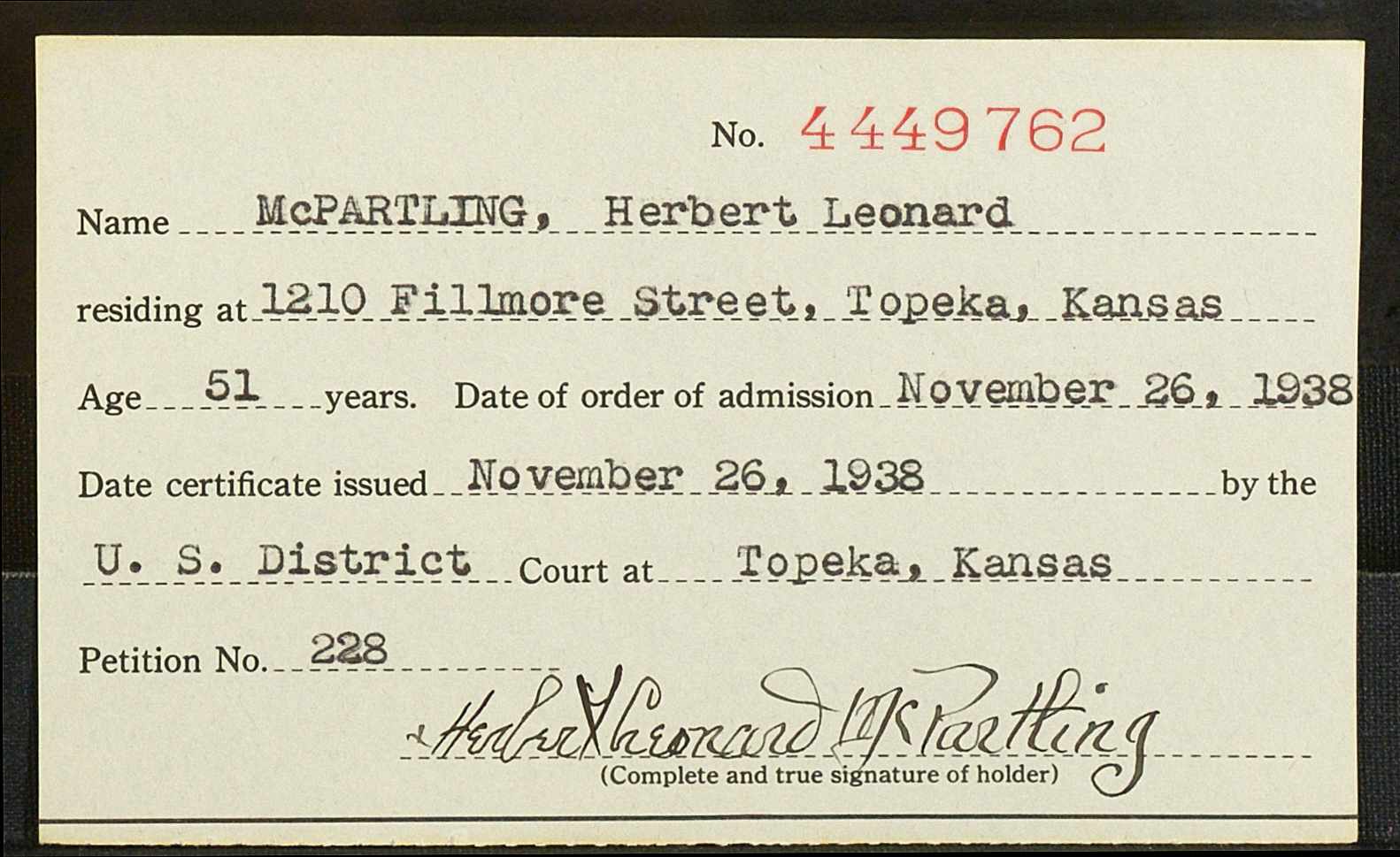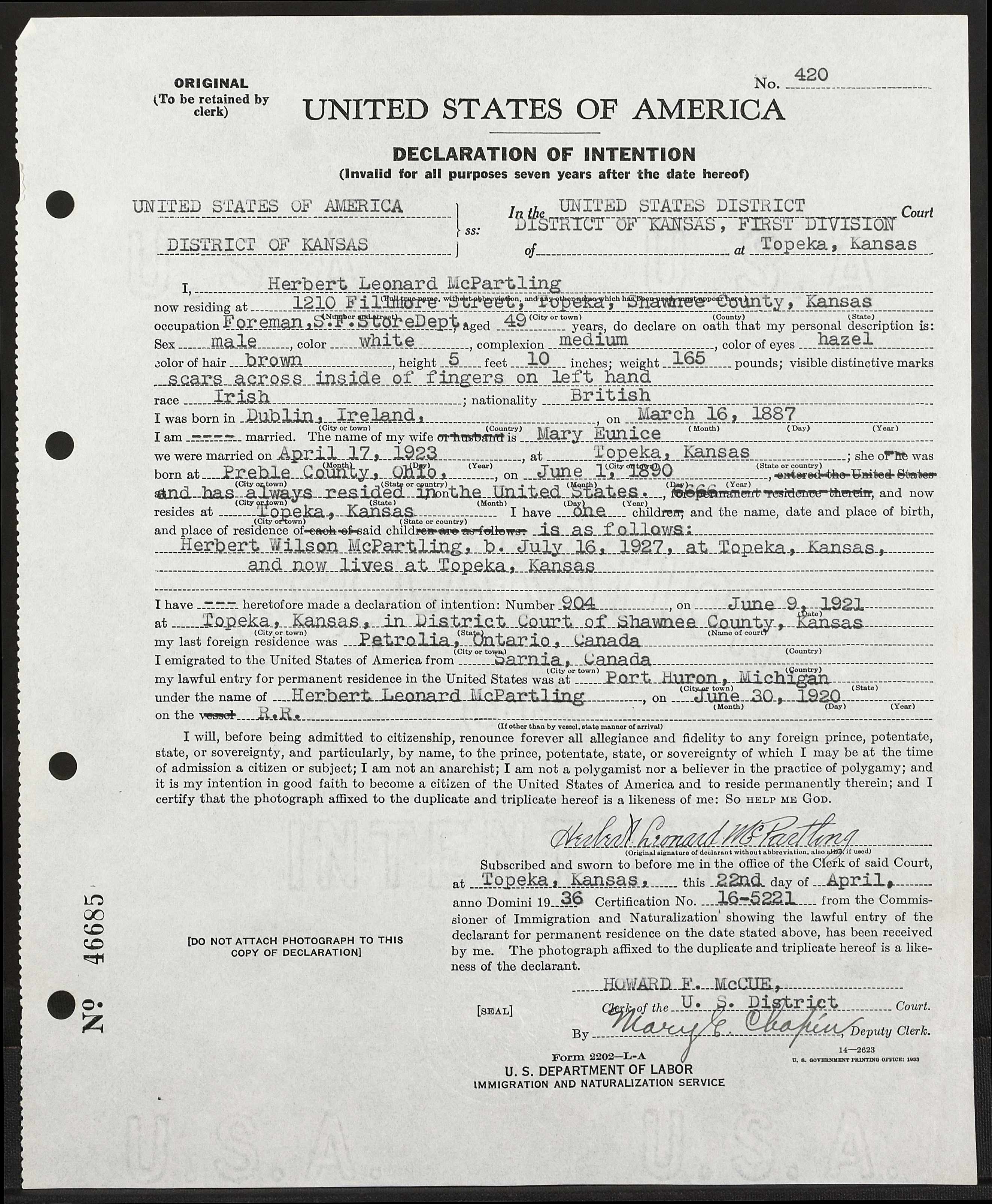 Family Search: When Private Herbert Leonard McPartling was born on 16 March 1884, in Dublin, County Dublin, Ireland, his father, Edward Leslie McPartling, was 47 and his mother, Bridget Teresa Ryan, was 28. He married Mary Eunice Wilson on 17 April 1923, in Topeka, Shawnee, Kansas, United States. They were the parents of at least 1 son and 1 daughter. He immigrated to Topeka, Shawnee, Kansas, United States in 1938 and lived in Topeka, Lawrence, Mississippi, United States in 1921. He registered for military service in 1915. In 1915, at the age of 31, his occupation is listed as salesman. He died on 15 August 1962, in Topeka, Shawnee, Kansas, United States, at the age of 78, and was buried in Penwell-Gabel Cemetery and Mausoleum, Topeka, Shawnee, Kansas, United States.