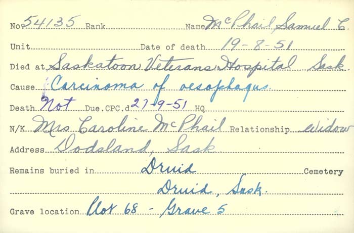 Family Search: When Samuel Calvin Mcphail was born on 13 July 1889, in Nassagaweya Township, Halton, Canada West, British Colonial America, his father, William Mcphail, was 33 and his mother, Elizabeth Donaldson, was 32. He lived in Halton, Ontario, Canada in 1901 and Dodsland, Winslow No. 319, Saskatchewan, Canada in 1921. He registered for military service in 1914. In 1914, at the age of 25, his occupation is listed as labourer. He died on 19 August 1951, at the age of 62, and was buried in Dodsland-Druid Cemetery, Dodsland, Winslow No. 319, Saskatchewan, Canada.