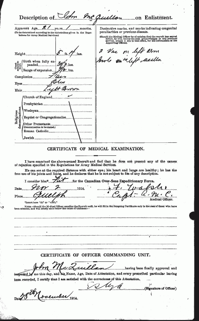 Family Search: When Private John McQuillan was born on 17 October 1893, in Guelph Township, Wellington, Ontario, Canada, his father, Arthur W. McQuillan, was 51 and his mother, Mary Jane Murphy, was 35. He lived in Guelph, Wellington, Ontario, Canada in 1921 and Toronto, Ontario, Canada in 1964. He registered for military service in 1914. In 1914, at the age of 21, his occupation is listed as printer in Guelph, Wellington, Ontario, Canada.