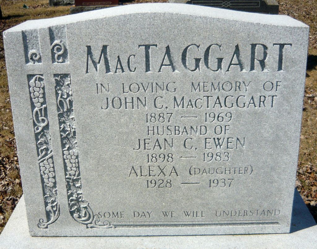 Family Search: When John “Jack” Campbell MacTaggart was born on 14 January 1887, in Sonya, Kawartha Lakes, Ontario, Canada, his father, Donald Lachan Mc Laggart, was 34 and his mother, Flora Campbell, was 29. He married Jean Cathleen Ewen on 31 December 1921, in Toronto, York, Ontario, Canada. They were the parents of at least 1 daughter. He lived in Ontario, Ontario, Canada in 1901 and Sonya, Victoria, Ontario, Canada in 1915. He registered for military service in 1915. In 1915, at the age of 28, his occupation is listed as farmer in Sonya, Victoria, Ontario, Canada. He died on 27 June 1969, in Seagrave, Scugog, Durham, Ontario, Canada, at the age of 82, and was buried in McNeil-Wick Cemetery, Layton, Brock, Ontario, Ontario, Canada.