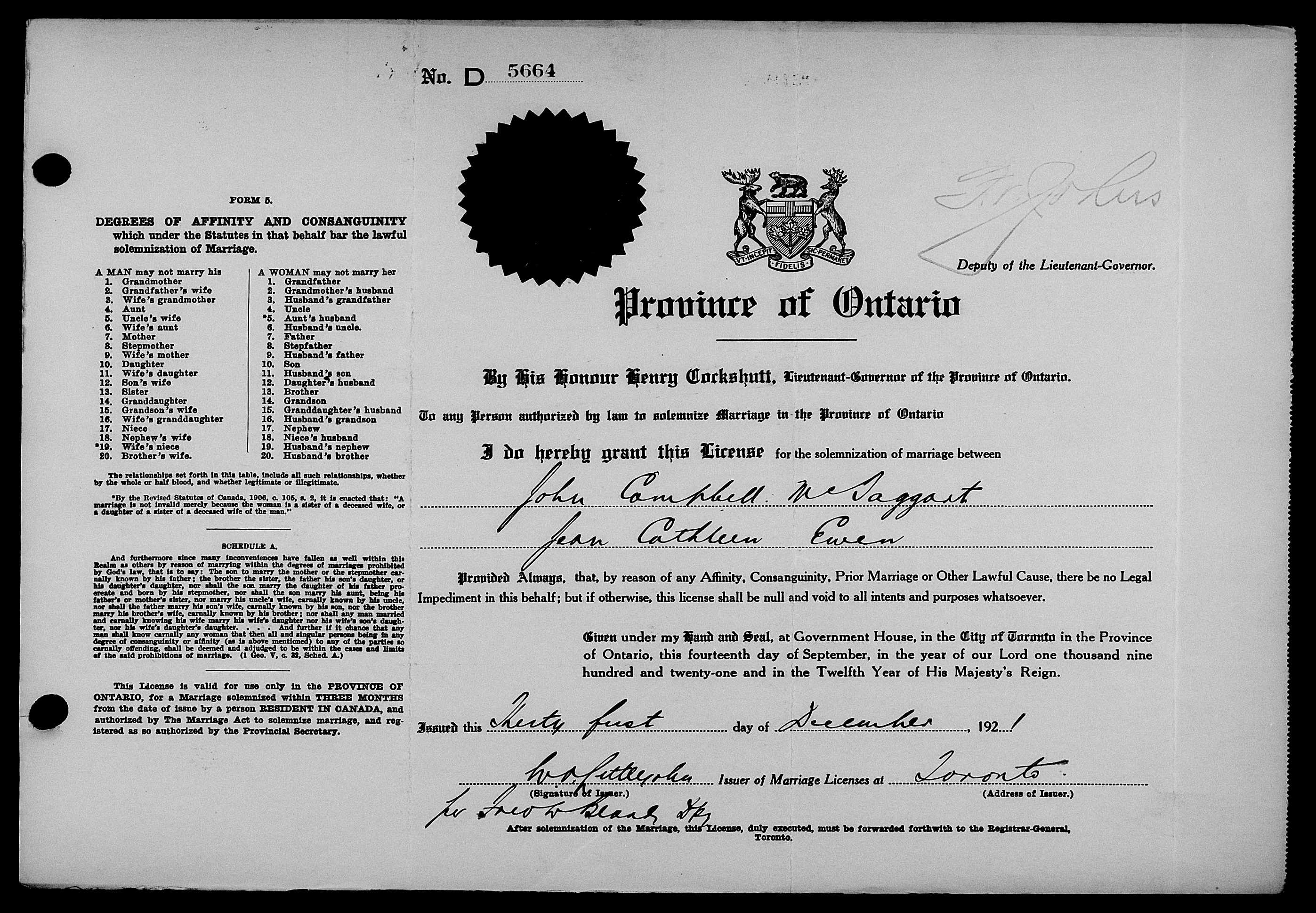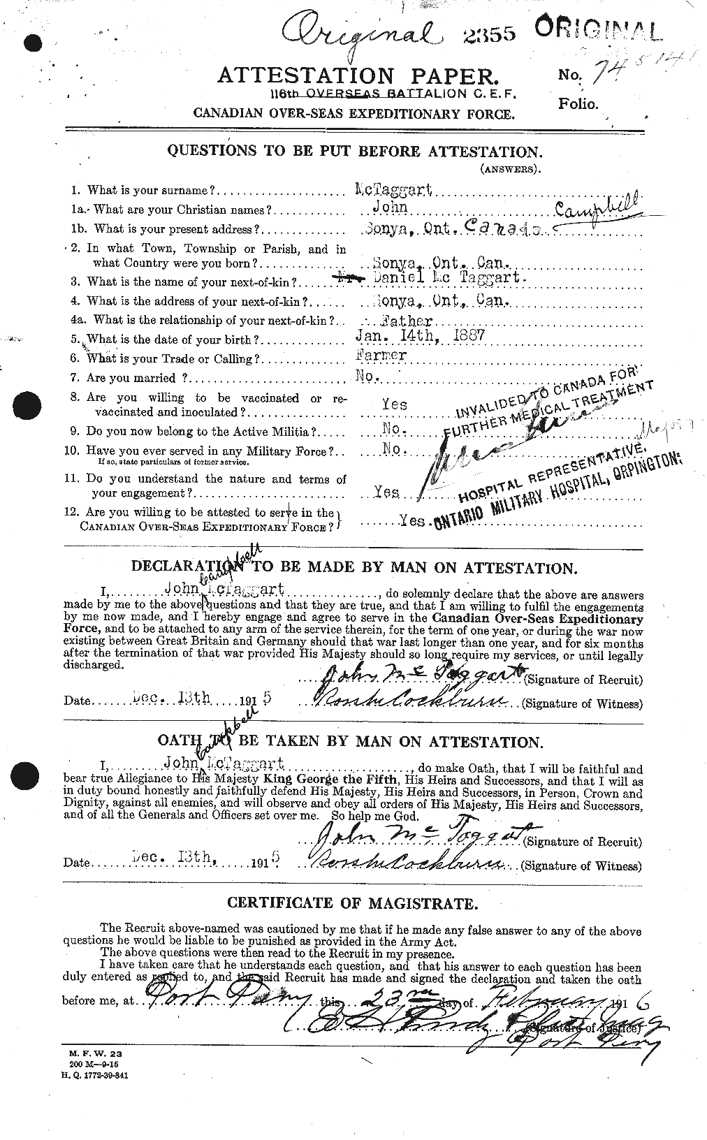 Family Search: When John “Jack” Campbell MacTaggart was born on 14 January 1887, in Sonya, Kawartha Lakes, Ontario, Canada, his father, Donald Lachan Mc Laggart, was 34 and his mother, Flora Campbell, was 29. He married Jean Cathleen Ewen on 31 December 1921, in Toronto, York, Ontario, Canada. They were the parents of at least 1 daughter. He lived in Ontario, Ontario, Canada in 1901 and Sonya, Victoria, Ontario, Canada in 1915. He registered for military service in 1915. In 1915, at the age of 28, his occupation is listed as farmer in Sonya, Victoria, Ontario, Canada. He died on 27 June 1969, in Seagrave, Scugog, Durham, Ontario, Canada, at the age of 82, and was buried in McNeil-Wick Cemetery, Layton, Brock, Ontario, Ontario, Canada.