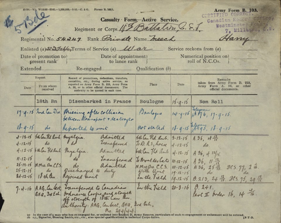 One of the men involved with the collision with the British Royal Navy destroyer during the Battalion’s crossing 14/15 September 1915.