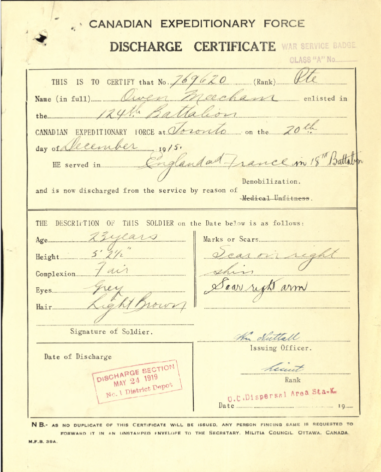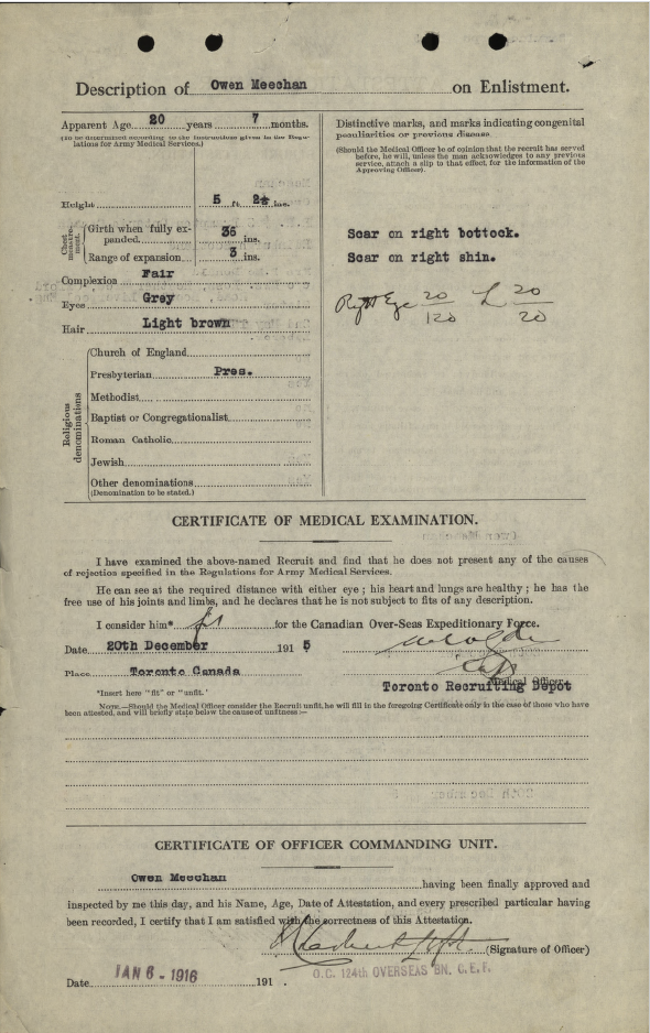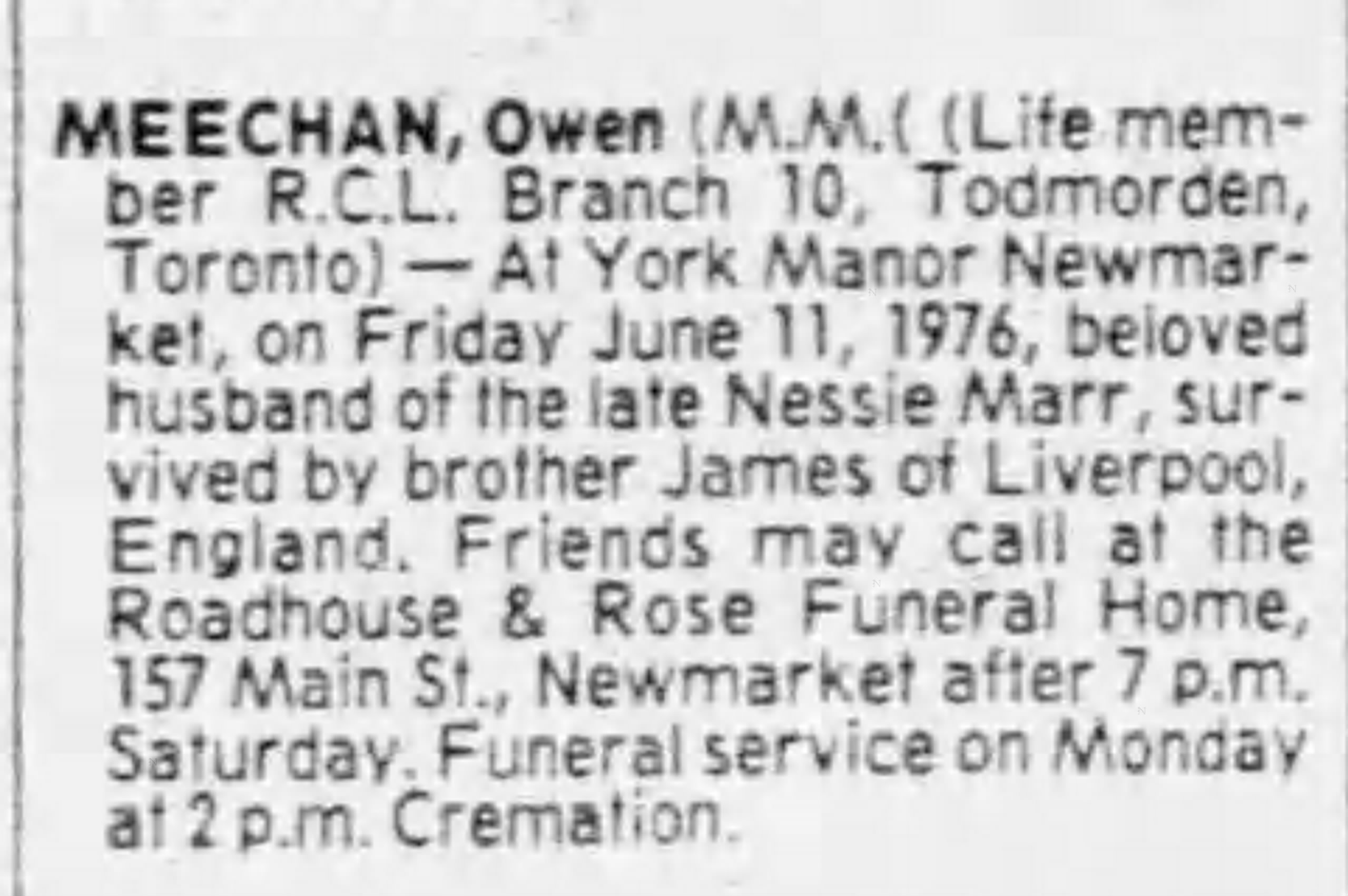 Family Search: Private Owen Meechan was born on 2 May 1895, in Edinburgh, Scotland, United Kingdom as the son of John Meechan. He married Jessie Agnes Marr on 16 June 1933, in Toronto, York, Ontario, Canada. He lived in Snelgrove, Brampton, Peel, Ontario, Canada in 1921 and Toronto, York, Ontario, Canada in 1931. He registered for military service in 1915. In 1931, at the age of 36, his occupation is listed as truck driver in Toronto, York, Ontario, Canada. He died on 11 June 1976, in Newmarket, York, Ontario, Canada, at the age of 81, and was buried in Mount Pleasant Cemetery, Toronto, Ontario, Canada.