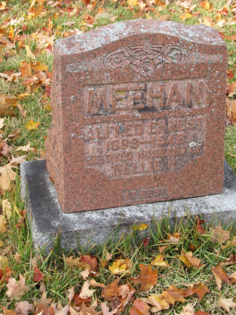 Family Search: Alfred Ernest Meehan was born on 6 April 1892, in Buckingham, Buckinghamshire, England, United Kingdom as the son of Arthur F Meehan and Elizabeth Askew. He lived in Woodstock, Oxford, Ontario, Canada in 1925. He registered for military service in 1914. In 1914, at the age of 22, his occupation is listed as labourer. He died on 26 May 1946, in London, Ontario, Canada, at the age of 54.