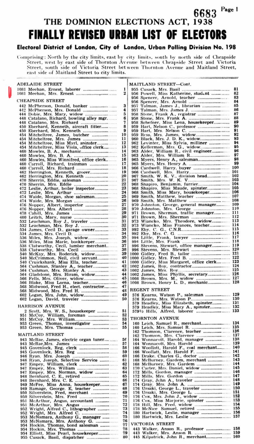Family Search: Alfred Ernest Meehan was born on 6 April 1892, in Buckingham, Buckinghamshire, England, United Kingdom as the son of Arthur F Meehan and Elizabeth Askew. He lived in Woodstock, Oxford, Ontario, Canada in 1925. He registered for military service in 1914. In 1914, at the age of 22, his occupation is listed as labourer. He died on 26 May 1946, in London, Ontario, Canada, at the age of 54.