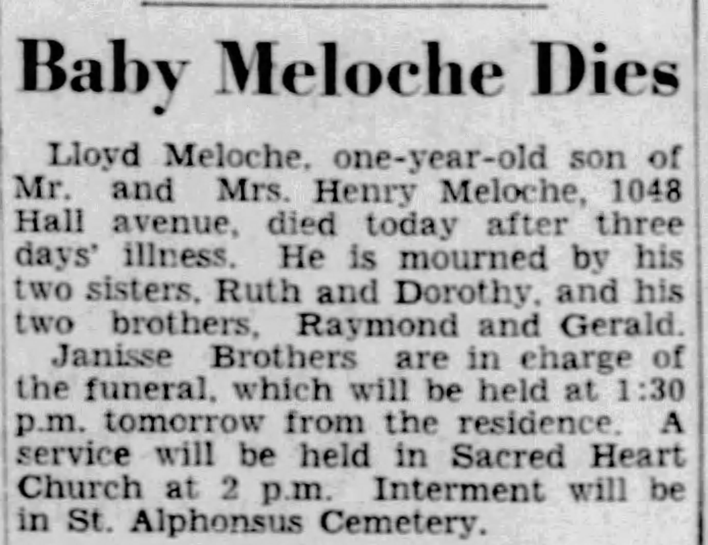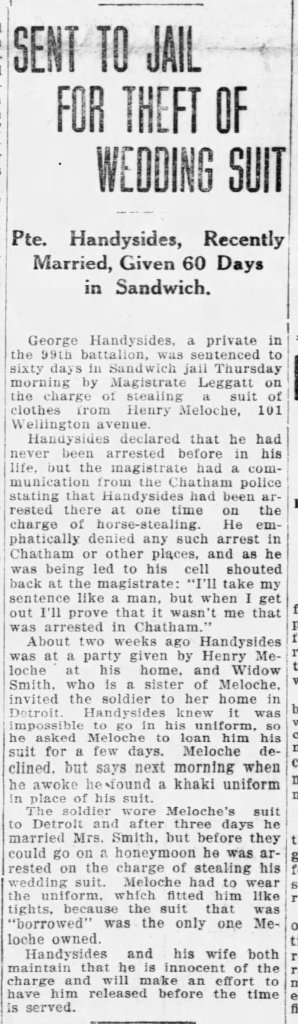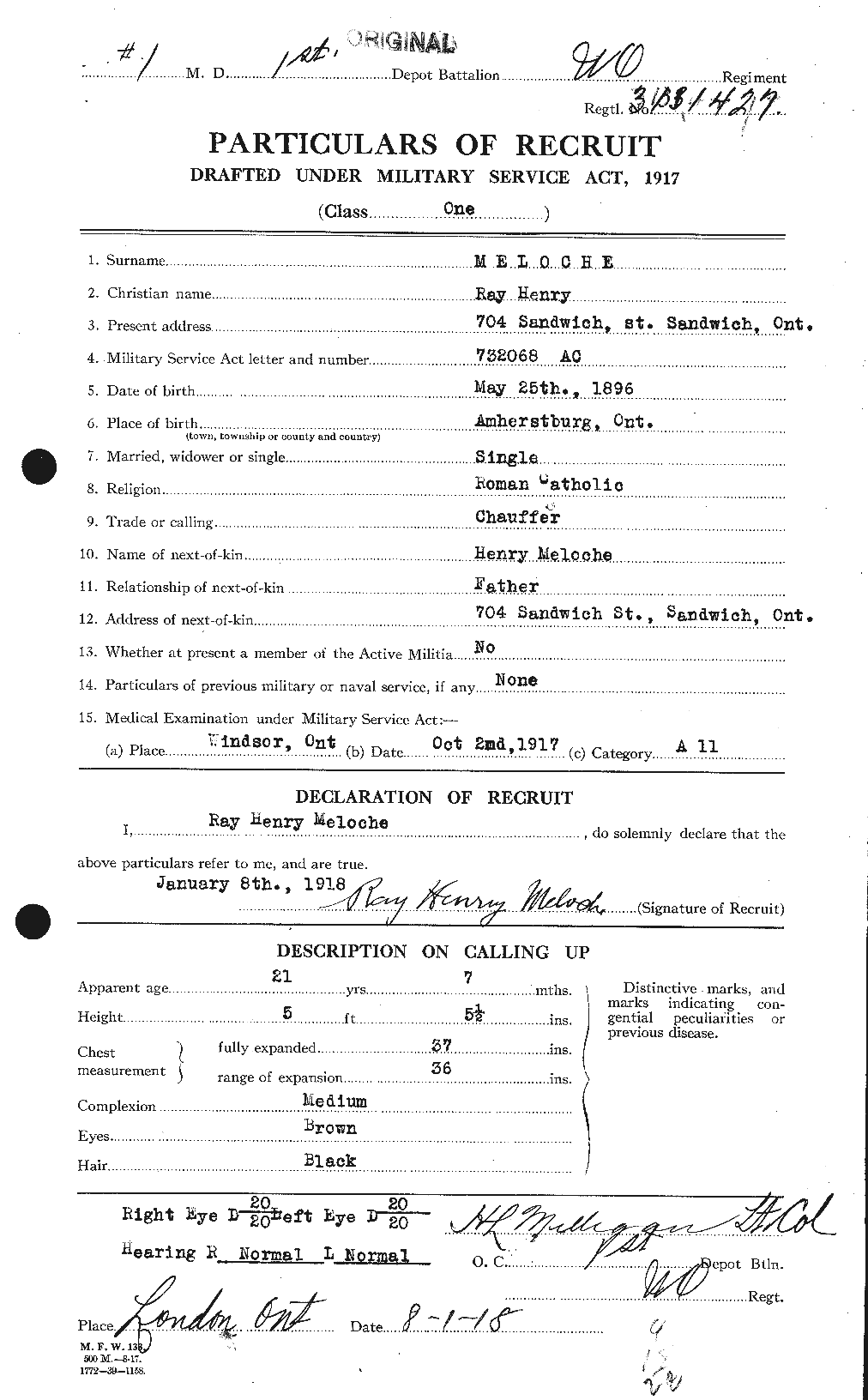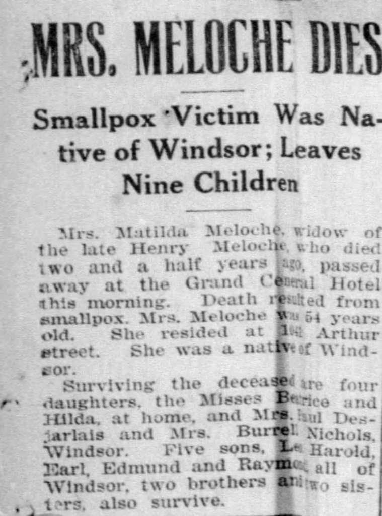 Family Search: When Private Henry Raymond Meloche was born on 25 May 1896, in Amherstburg, Essex, Ontario, Canada, his father, Henry Alexandre Meloche, was 29 and his mother, Mathilde Monique Langlois, was 25. He had at least 3 sons and 2 daughters with Emma Marentette. He lived in Essex, Ontario, Canada in 1901 and Windsor, Sandwich, Essex, Ontario, Canada for about 10 years. He registered for military service in 1918. In 1953, his occupation is listed as mechanic, s. w. & a. railway in Windsor, Essex, Ontario, Canada. He died on 16 May 1953, in Windsor, Essex, Ontario, Canada, at the age of 56, and was buried in Saint Alphonsus Cemetery, Windsor, Essex, Ontario, Canada.