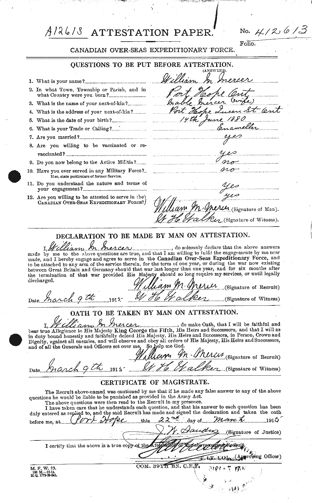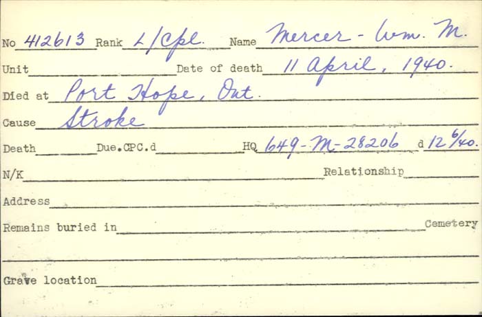 Family Search: When Private William Mark Mercer was born on 14 June 1880, in Port Hope, Durham, Ontario, Canada, his father, Horatio Nelson Mercer, was 23 and his mother, Mary Ann Nelson, was 14. He married Mable Dewell on 5 September 1908, in Port Hope, Durham, Ontario, Canada. They were the parents of at least 1 daughter. He lived in Durham, Ontario, Canada in 1911. He registered for military service in 1915. In 1915, at the age of 35, his occupation is listed as enamaler in Port Hope, Durham, Ontario, Canada. He died on 11 April 1940, at the age of 59, and was buried in Port Hope, Durham, Ontario, Canada.