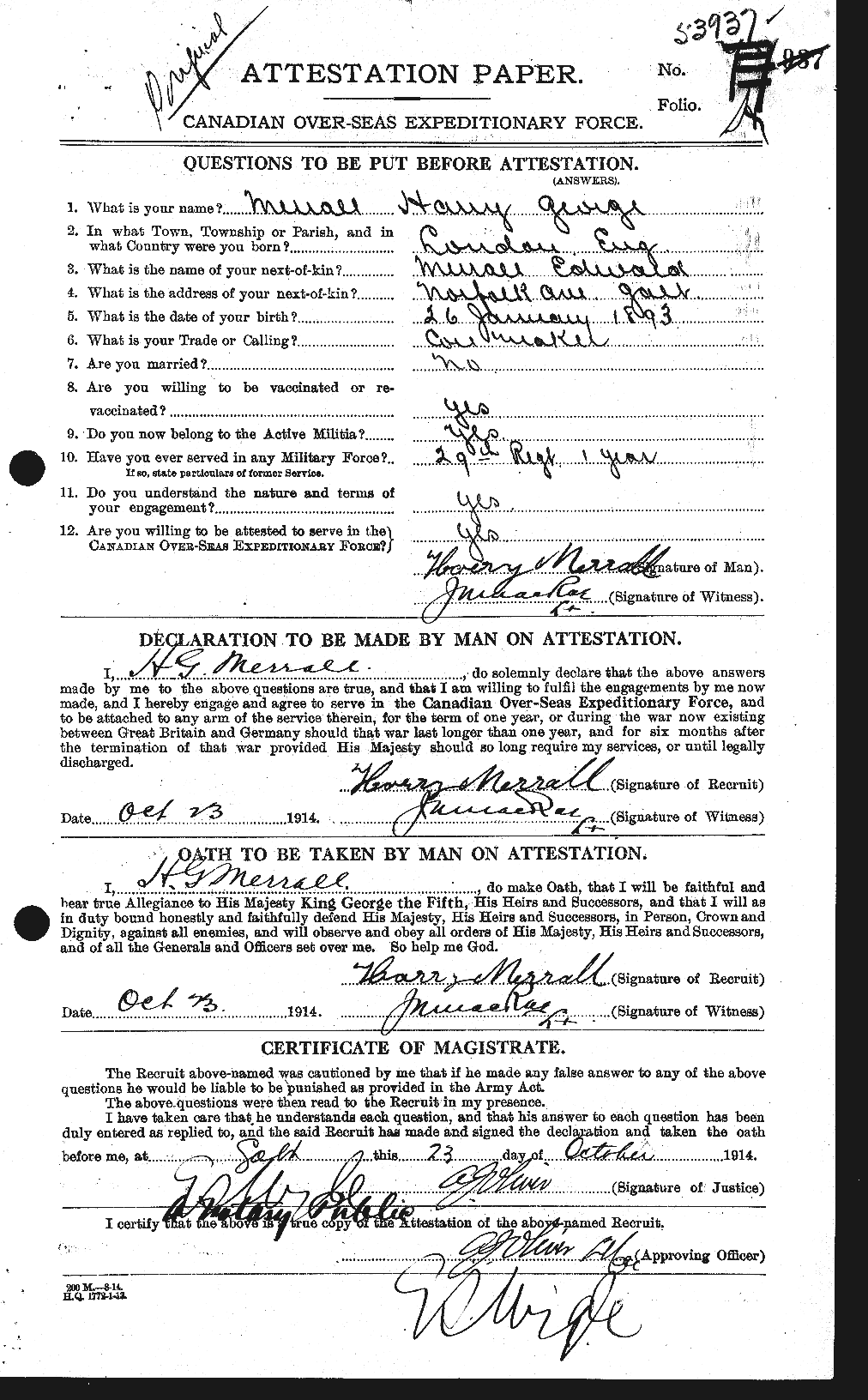 Harry Charles MERRALL [scrapbook] 1 (Edward James ) was born 26 Jan 1893. He died 2 Nov 1959 in London, Ontario and was buried in Galt, Ontario.