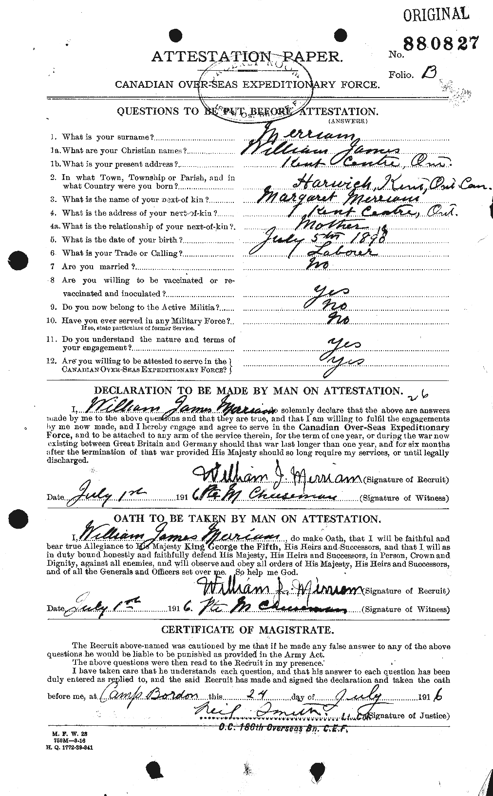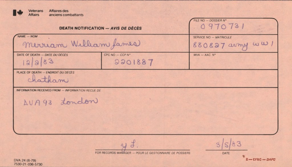 Merriam, William James: Service no. 880827 Digitized Service Record Source: Gathering Our Heroes Find-A-Grave Private William James Merriam. Source: Gathering Our Heroes Share this: Click to email a link to a friend (Opens in new window) Email Click to share on Facebook (Opens in new window) Facebook Click to share on X (Opens in new window) X Click to share on Reddit (Opens in new window) Reddit Click to share on LinkedIn (Opens in new window) LinkedIn Click to print (Opens in new window) Print Click to share on Tumblr (Opens in new window) Tumblr Click to share on Pocket (Opens in new window) Pocket Click to share on Pinterest (Opens in new window) Pinterest Click to share on Telegram (Opens in new window) Telegram Click to share on WhatsApp (Opens in new window) WhatsApp Like Loading...