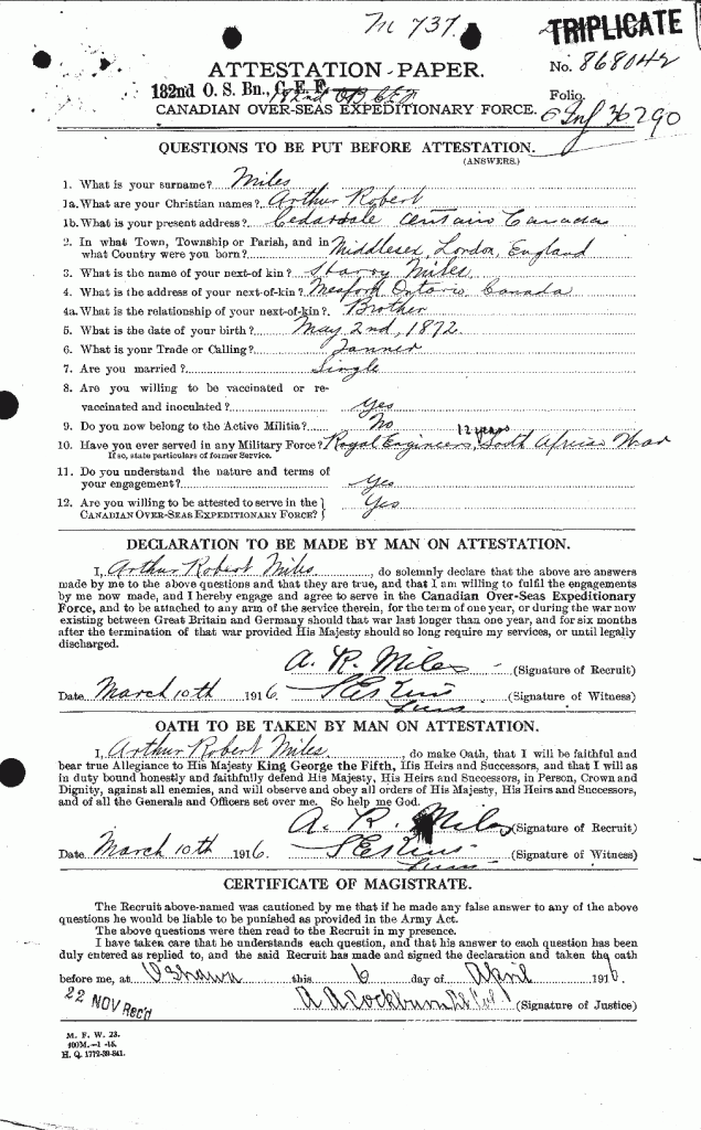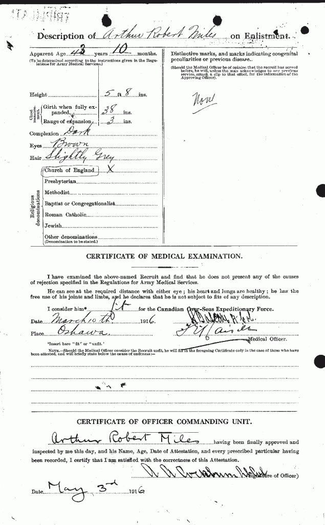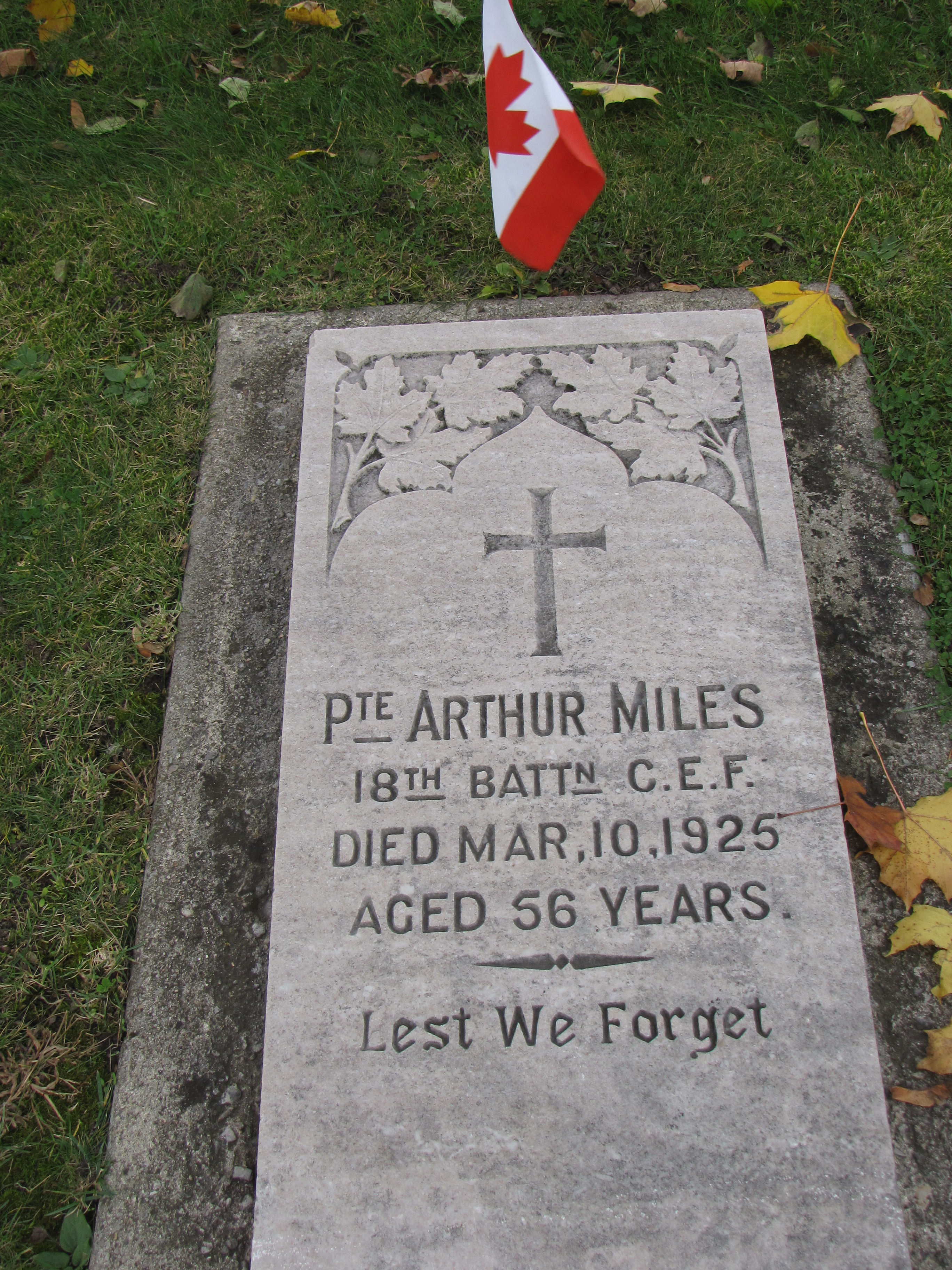 Family Search: When Private Arthur Robert Miles was born on 2 May 1868, in London, England, United Kingdom, his father, Charles H. Miles, was 29 and his mother, Mary Sharpe, was 30. He immigrated to Canada in 1913 and lived in St Pancras, London, England, United Kingdom for about 10 years. He registered for military service in 1916. In 1916, at the age of 48, his occupation is listed as tailor in Cedar Dale, Oshawa, Ontario, Ontario, Canada. He died on 10 March 1925, in Oshawa, Ontario, Ontario, Canada, at the age of 56, and was buried in Union Cemetery, Oshawa, Durham, Ontario, Canada.