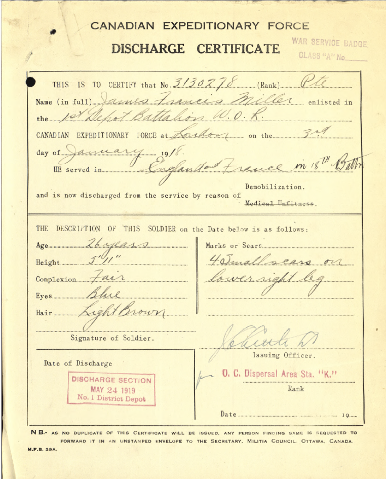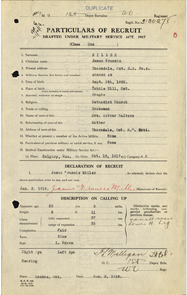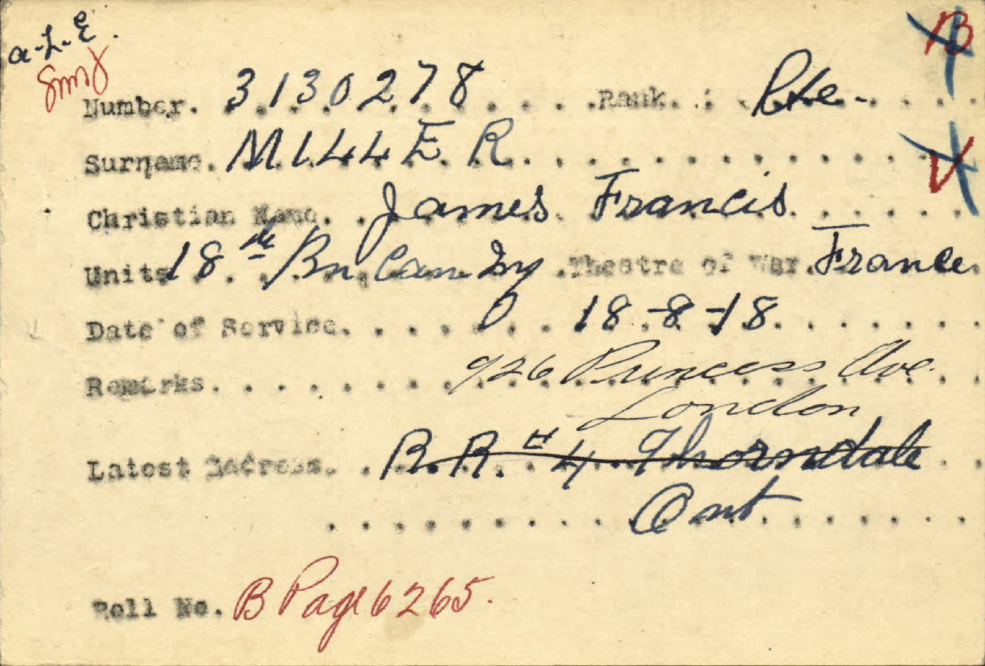 Family Search:When Private James Francis Miller was born on 5 September 1892, in Cobble Hill, Middlesex, Ontario, Canada, his father, John Miller, was 27 and his mother, Hannah Woosnam, was 21. He lived in Middlesex, Ontario, Canada in 1901 and Thorndale, Middlesex, Ontario, Canada in 1918. He registered for military service in 191. In 1918, at the age of 26, his occupation is listed as brakeman in Thorndale, Middlesex, Ontario, Canada. He died on 30 October 1957, in London, Ontario, Canada, at the age of 65, and was buried in Zion Hill Cemetery, Three Bridges, Middlesex, Ontario, Canada.