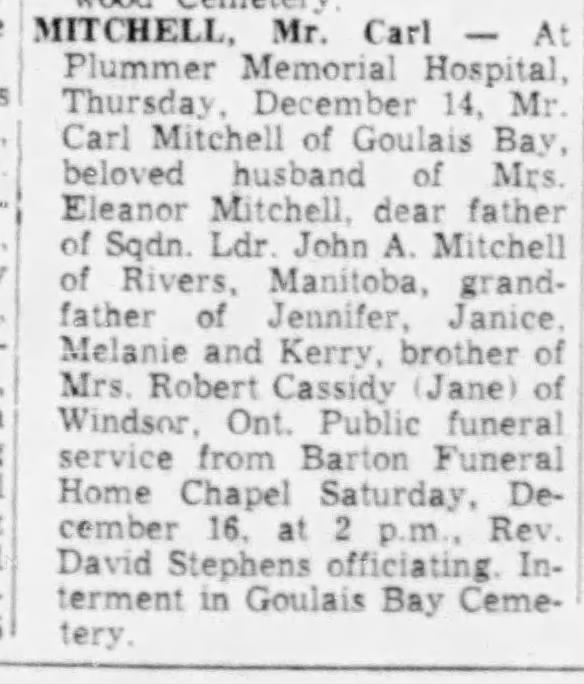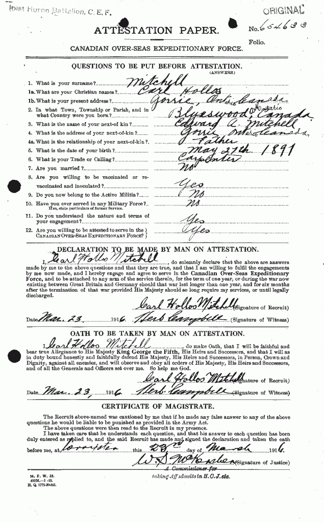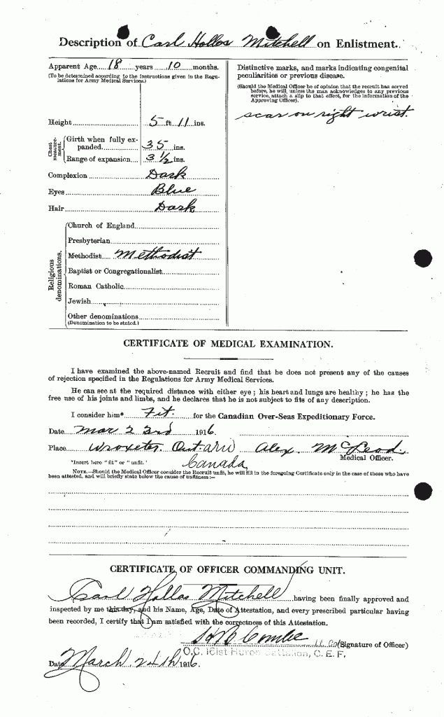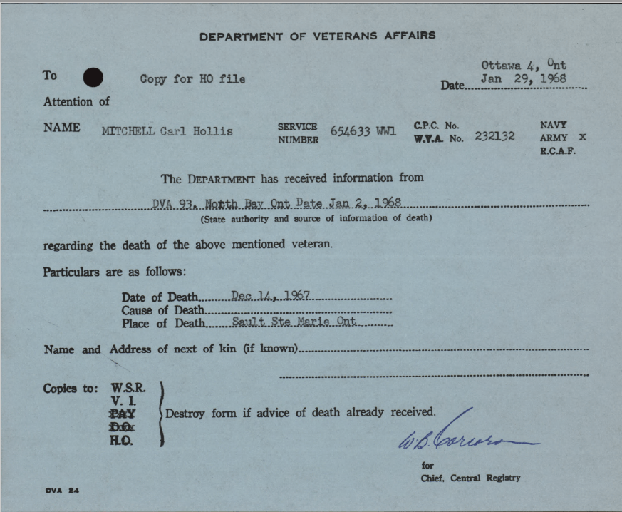 Family Search: When Corporal Carl Hollis Mitchell was born on 27 March 1897, in Gorrie, Huron, Ontario, Canada, his father, Edward Albert Mitchell, was 28 and his mother, Minnie May Reid Mitchell, was 23. He married Gladys Julia Brown on 3 February 1922, in Blytheswood, Leamington, Essex, Ontario, Canada. They were the parents of at least 2 sons. He immigrated to United States in 1900 and lived in Ontario, Canada in 1922 and Sandwich East Township, Essex, Ontario, Canada in 1931. He registered for military service in 1915. In 1916, at the age of 19, his occupation is listed as carpenter. He died on 14 December 1967, in Sault Ste. Marie, Algoma, Ontario, Canada, at the age of 70, and was buried in Goulais River, Algoma Unorganized North Part, Algoma, Ontario, Canada.