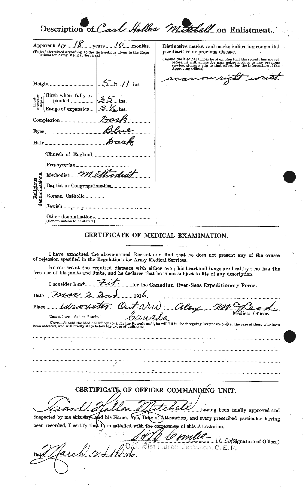 Family Search: When Corporal Carl Hollis Mitchell was born on 27 March 1897, in Gorrie, Huron, Ontario, Canada, his father, Edward Albert Mitchell, was 28 and his mother, Minnie May Reid Mitchell, was 23. He married Gladys Julia Brown on 3 February 1922, in Blytheswood, Leamington, Essex, Ontario, Canada. They were the parents of at least 2 sons. He immigrated to United States in 1900 and lived in Ontario, Canada in 1922 and Sandwich East Township, Essex, Ontario, Canada in 1931. He registered for military service in 1915. In 1916, at the age of 19, his occupation is listed as carpenter. He died on 14 December 1967, in Sault Ste. Marie, Algoma, Ontario, Canada, at the age of 70, and was buried in Goulais River, Algoma Unorganized North Part, Algoma, Ontario, Canada.