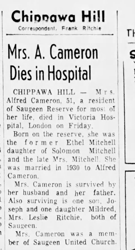 Family Search: Solomon Mitchell was born on 20 June 1889, in Saugeen 29, Bruce, Ontario, Canada as the son of John Mitchell and Betsy Stephens. He married Sarah Jane Root on 15 May 1908, in Amabel Township, Bruce, Ontario, Canada. They were the parents of at least 1 son and 2 daughters. He registered for military service in 1916. In 1908, at the age of 19, his occupation is listed as farmer in Saugeen 29, Bruce, Ontario, Canada. He died on 23 April 1973, in Ohsweken, Six Nations (Part) 40, Six Nations, Ontario, Canada, at the age of 83, and was buried in Chippawa Hill Saugeen Reserve Cemetery, Chippawa Hill, Saugeen 29, Bruce, Ontario, Canada.