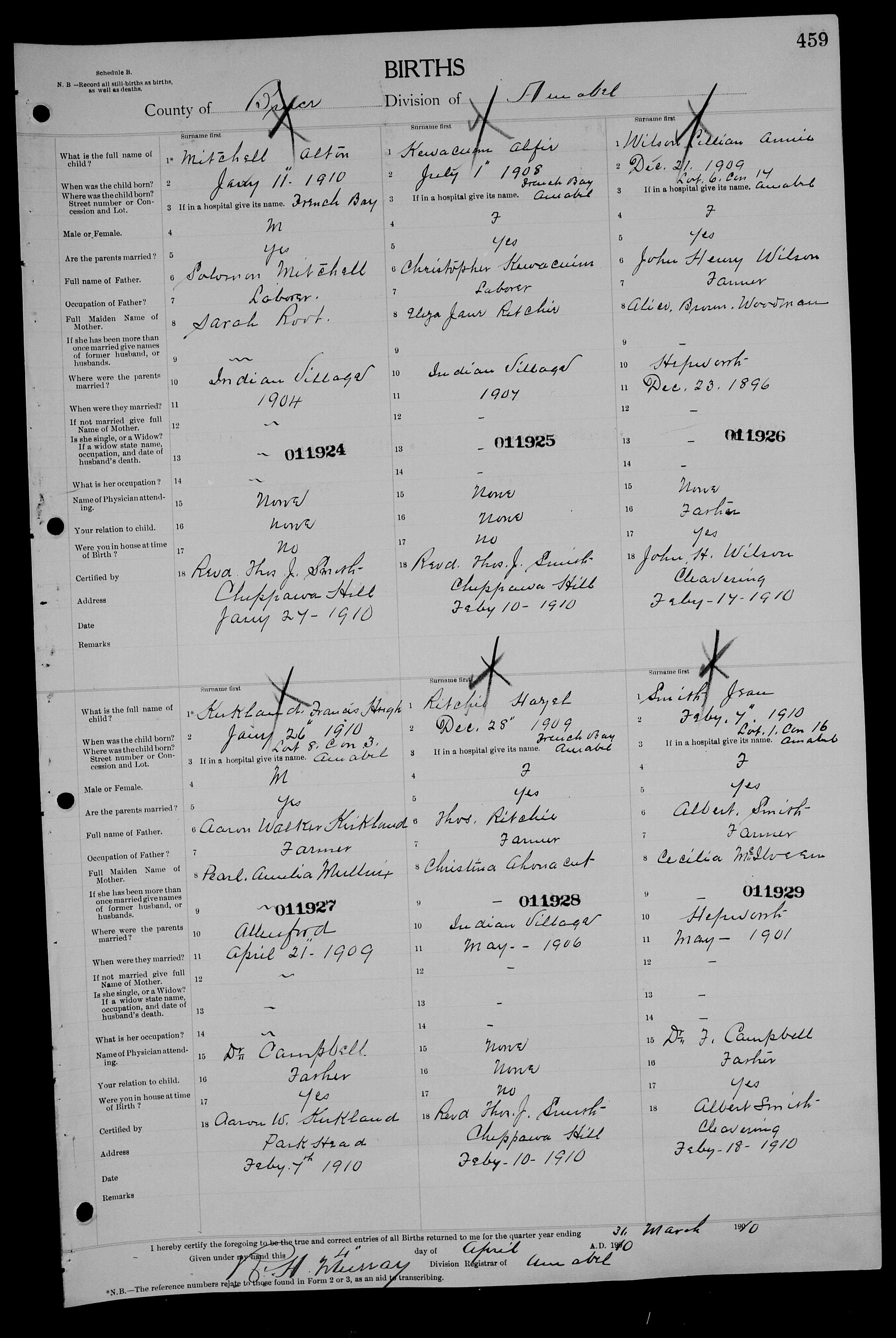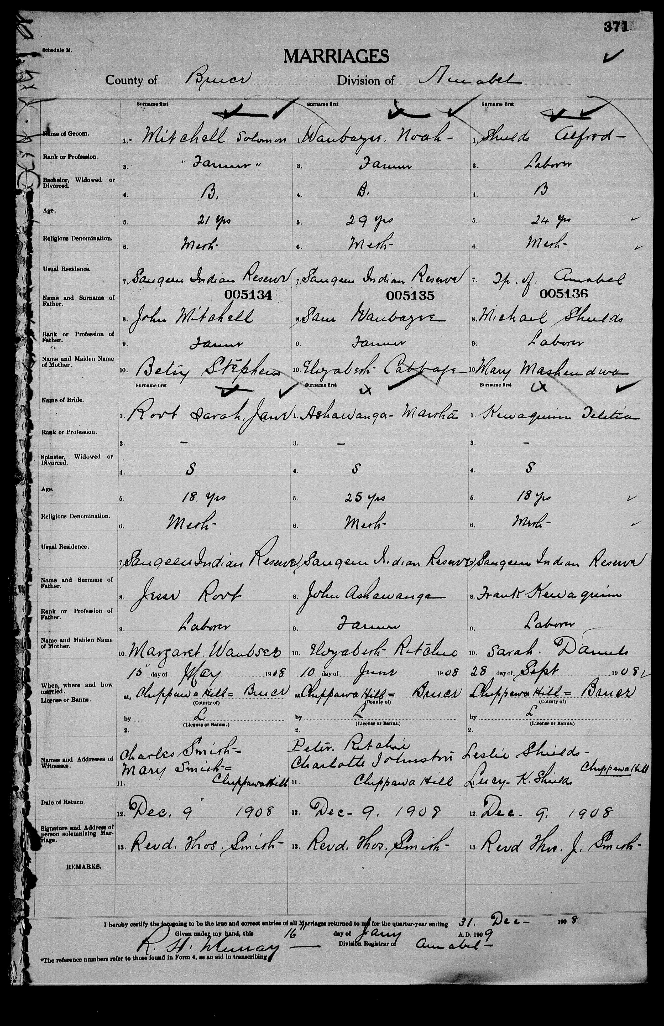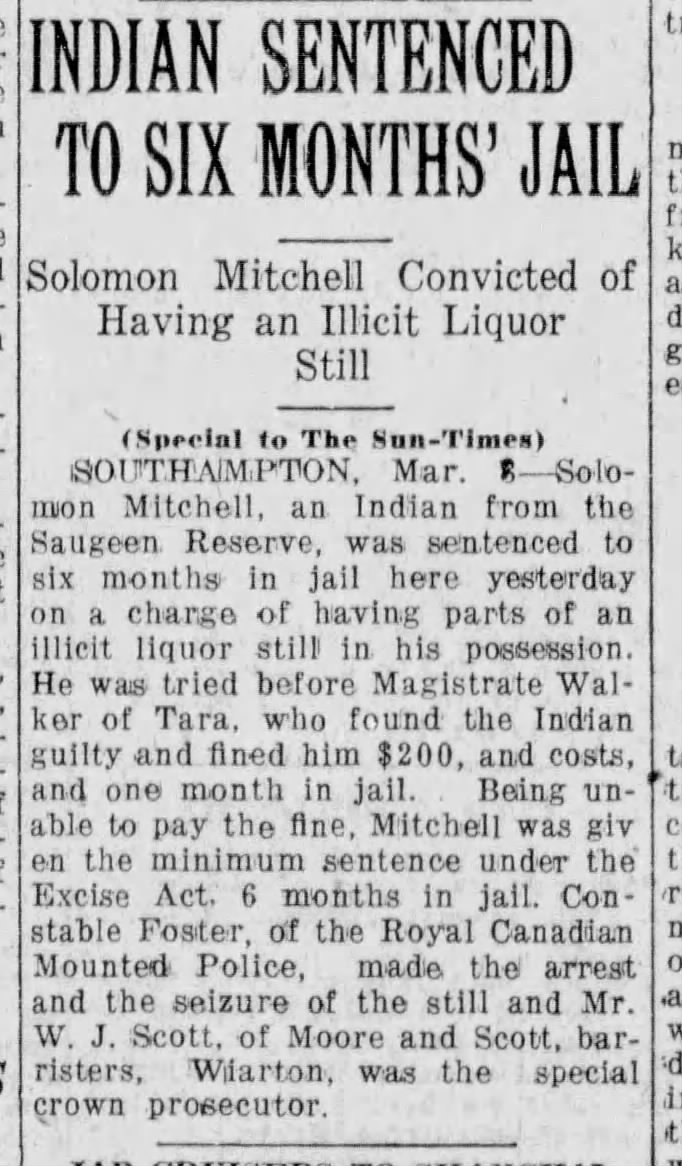 Family Search: Solomon Mitchell was born on 20 June 1889, in Saugeen 29, Bruce, Ontario, Canada as the son of John Mitchell and Betsy Stephens. He married Sarah Jane Root on 15 May 1908, in Amabel Township, Bruce, Ontario, Canada. They were the parents of at least 1 son and 2 daughters. He registered for military service in 1916. In 1908, at the age of 19, his occupation is listed as farmer in Saugeen 29, Bruce, Ontario, Canada. He died on 23 April 1973, in Ohsweken, Six Nations (Part) 40, Six Nations, Ontario, Canada, at the age of 83, and was buried in Chippawa Hill Saugeen Reserve Cemetery, Chippawa Hill, Saugeen 29, Bruce, Ontario, Canada.
