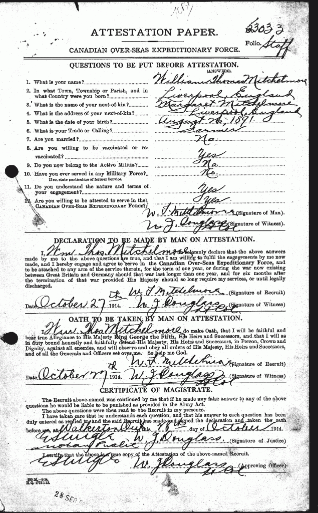 27Oct1914 enlisted in Canadian Over-Seas Expeditionary Force at Walkerton ON: unm farmer b 26Aug1891 Liverpool; next of kin: Margaret MITCHELMORE, Liverpool