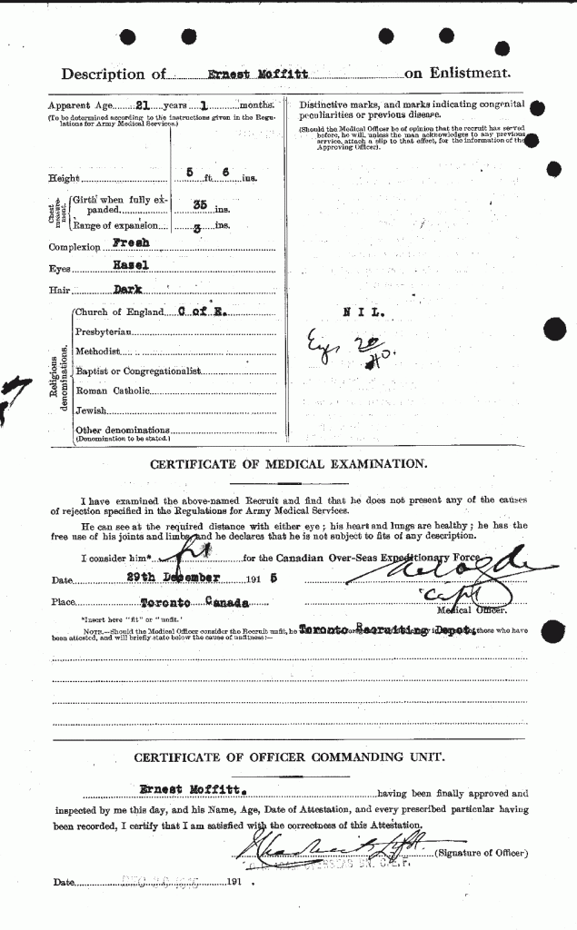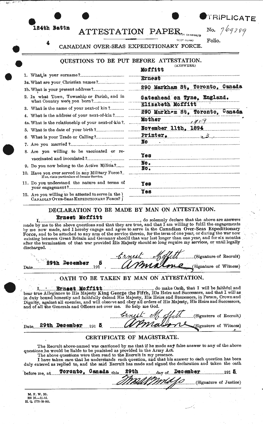 Moffitt, Ernest: Service no. 769289 Digitized Service Record Source: Per news clipping post by David Archer at 18th Battalion Facebook Page (not group). Find-A-Grave Moffitt, Ernest: Service no. 769289. Source: Toronto Telegram. May 1917. n Facebook Page (not group). Share this: Click to email a link to a friend (Opens in new window) Email Click to share on Facebook (Opens in new window) Facebook Click to share on X (Opens in new window) X Click to share on Reddit (Opens in new window) Reddit Click to share on LinkedIn (Opens in new window) LinkedIn Click to print (Opens in new window) Print Click to share on Tumblr (Opens in new window) Tumblr Click to share on Pocket (Opens in new window) Pocket Click to share on Pinterest (Opens in new window) Pinterest Click to share on Telegram (Opens in new window) Telegram Click to share on WhatsApp (Opens in new window) WhatsApp Like Loading...