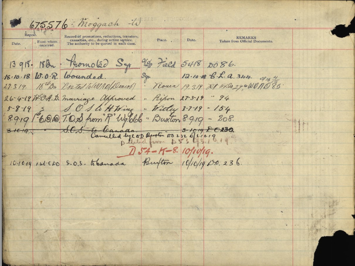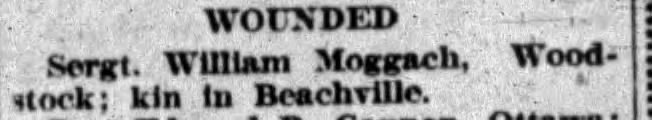 Family Search: When Private William Moggach was born on 2 September 1893, in Banffshire, Scotland, United Kingdom, his father, William Moggach Sr, was 37 and his mother, Agnes Bremner Burnett, was 40. He immigrated to Detroit, Wayne, Michigan, United States in 1943 and lived in Oxford, Ontario, Canada in 1911. He registered for military service in 1916. In 1916, at the age of 23, his occupation is listed as farm hand in Beachville, Oxford, Ontario, Canada. He died in 1975, at the age of 82, and was buried in Beachville, Oxford, Ontario, Canada.