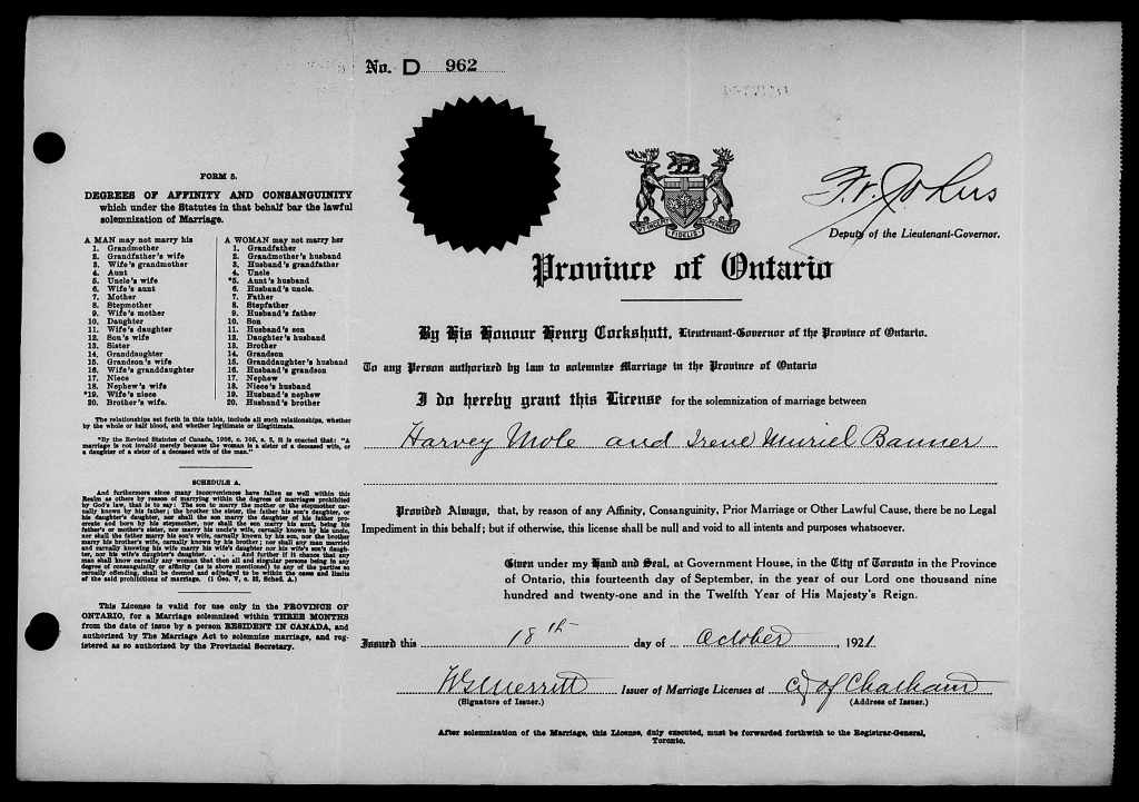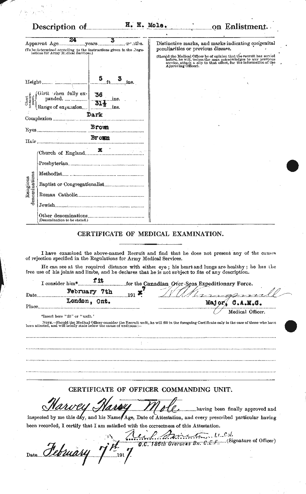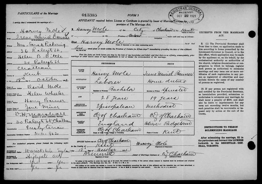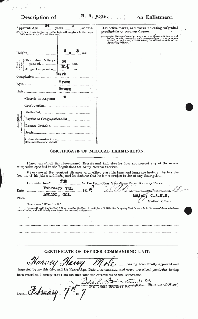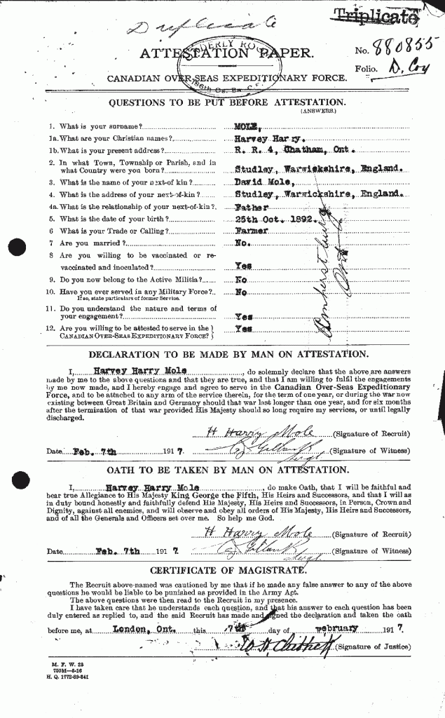 Family Search: Private Harvey Harry Mole was born on 25 October 1892, in Studley, Warwickshire, England, United Kingdom as the son of David Mole and Helen Wheeler. He married Irene Muriel Banner on 18 October 1921, in Chatham, Kent, Ontario, Canada. He immigrated to Canada in 1913 and lived in Chatham, Kent, Ontario, Canada for about 4 years. He registered for military service in 1917. In 1917, at the age of 25, his occupation is listed as farmer in Chatham, Kent, Ontario, Canada. He died in September 1965, at the age of 72, and was buried in Maple Leaf Cemetery, Chatham, Chatham-Kent, Ontario, Canada.