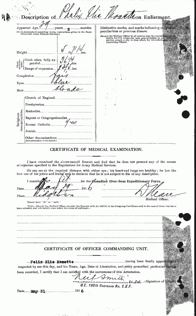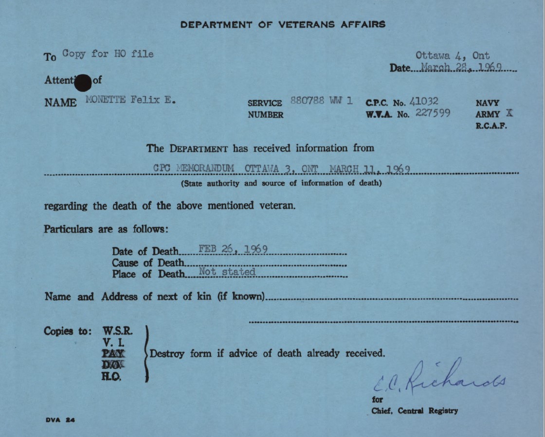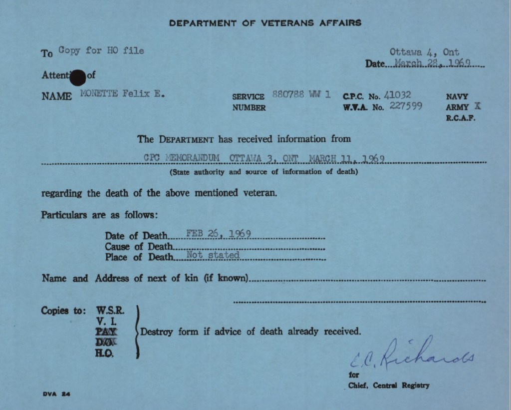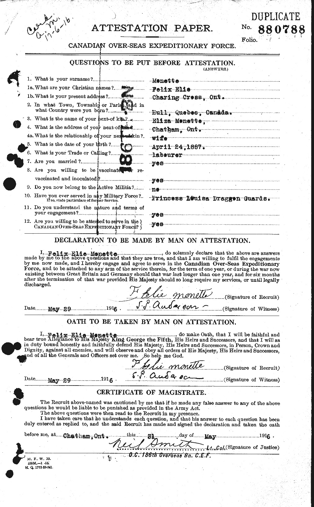 Monette, Felix Elie: Service no. 880788 Digitized Service Record Source: Per post at 18th Battalion Facebook Group by Allan Miller. Find-A-Grave Monette, Felix Elie: Service no. 880788. Source: Gathering Our Heroes. Circa 1916-1917. Share this: Click to email a link to a friend (Opens in new window) Email Click to share on Facebook (Opens in new window) Facebook Click to share on X (Opens in new window) X Click to share on Reddit (Opens in new window) Reddit Click to share on LinkedIn (Opens in new window) LinkedIn Click to print (Opens in new window) Print Click to share on Tumblr (Opens in new window) Tumblr Click to share on Pocket (Opens in new window) Pocket Click to share on Pinterest (Opens in new window) Pinterest Click to share on Telegram (Opens in new window) Telegram Click to share on WhatsApp (Opens in new window) WhatsApp Like Loading...