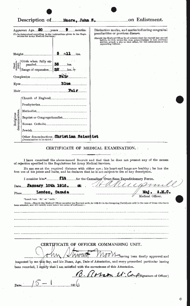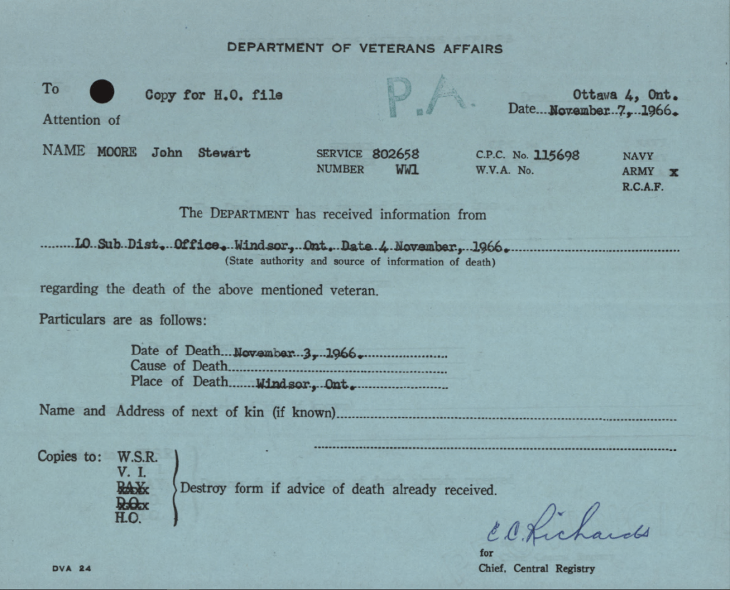 Family Search: Private John Stewart Moore was born on 29 March 1895, in London, Ontario, Canada as the son of James S. Moore and Annie Marshman. He lived in Leamington, Essex, Ontario, Canada in 1924. He registered for military service in 1916. In 1924, at the age of 29, his occupation is listed as drug clerk in Leamington, Essex, Ontario, Canada. He died on 3 November 1966, in Windsor, Essex, Ontario, Canada, at the age of 71, and was buried in Heavenly Rest Catholic Cemetery, Windsor, Essex, Ontario, Canada.